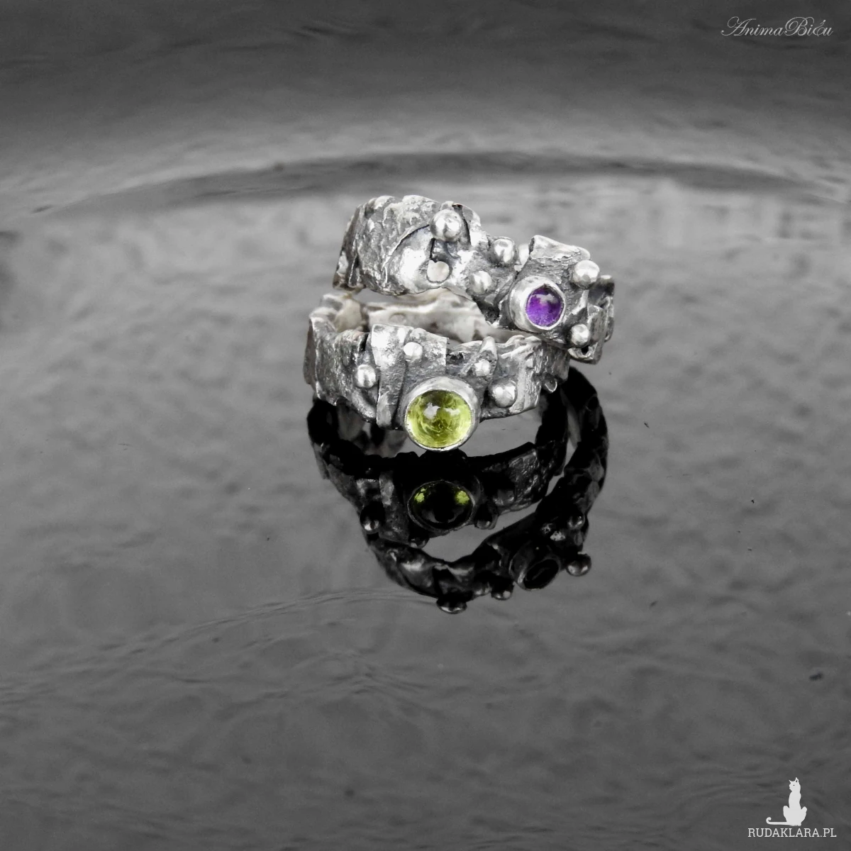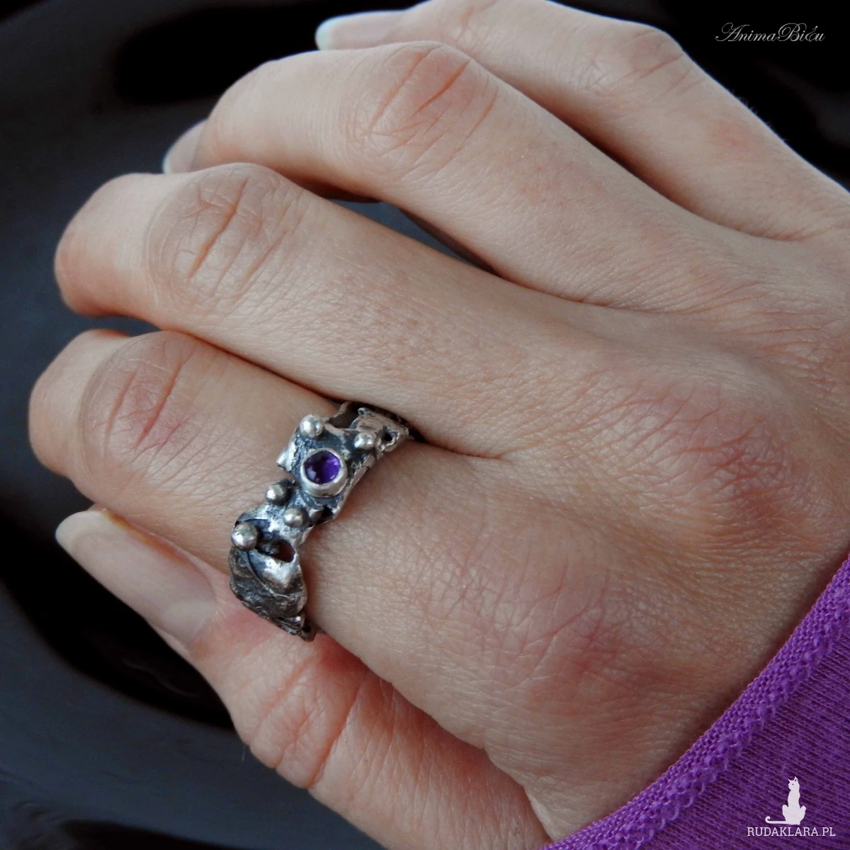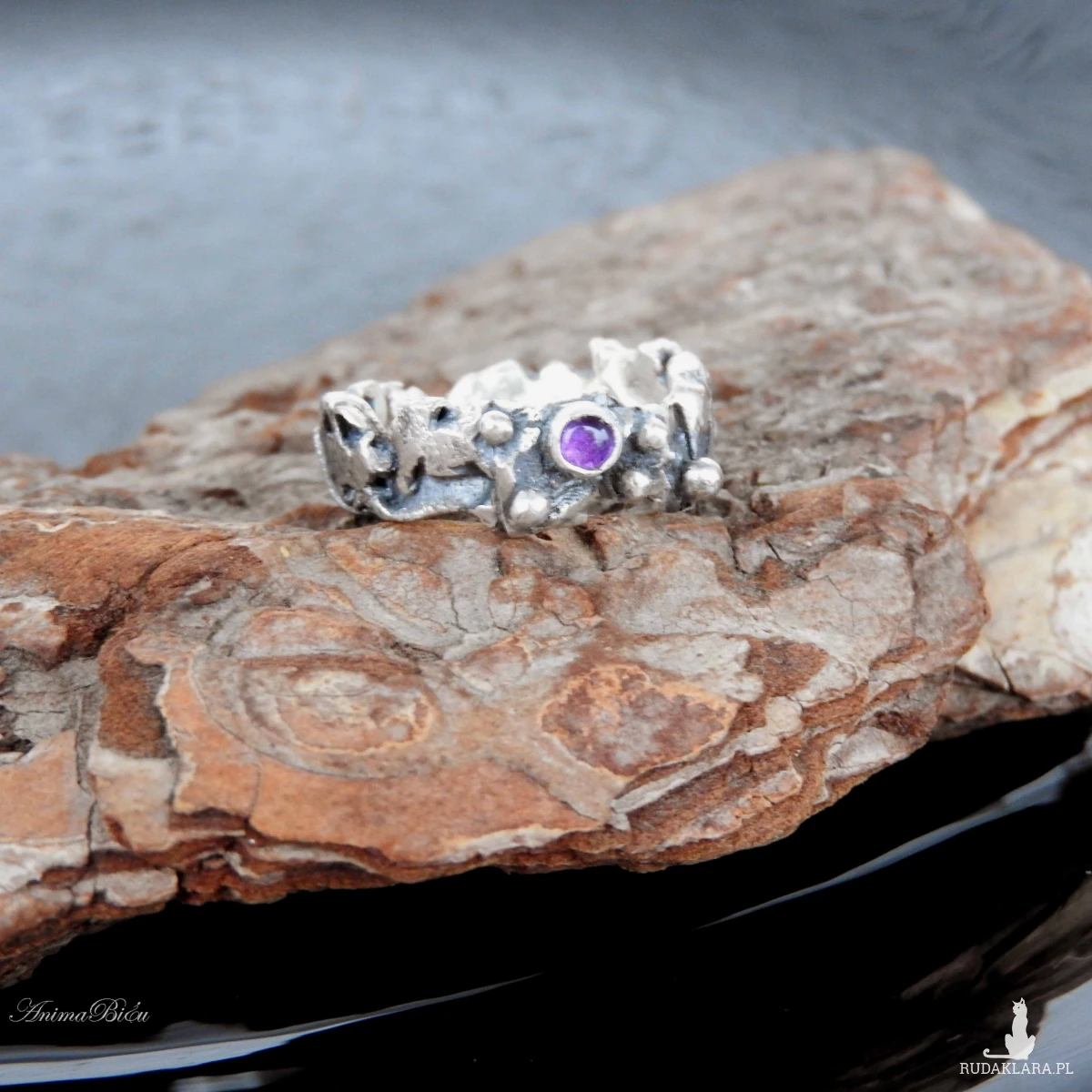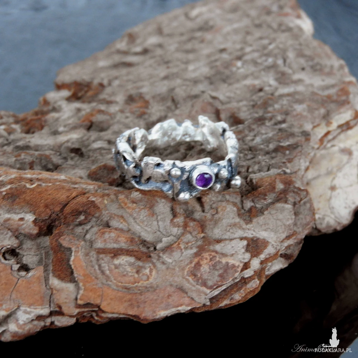 Obrączka srebrna z ametystem. Wykonana od podstaw ręcznie