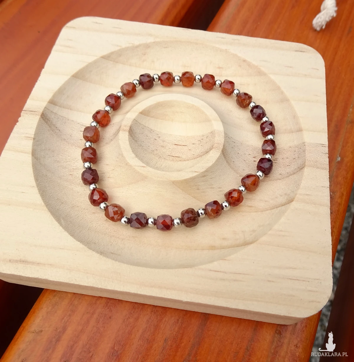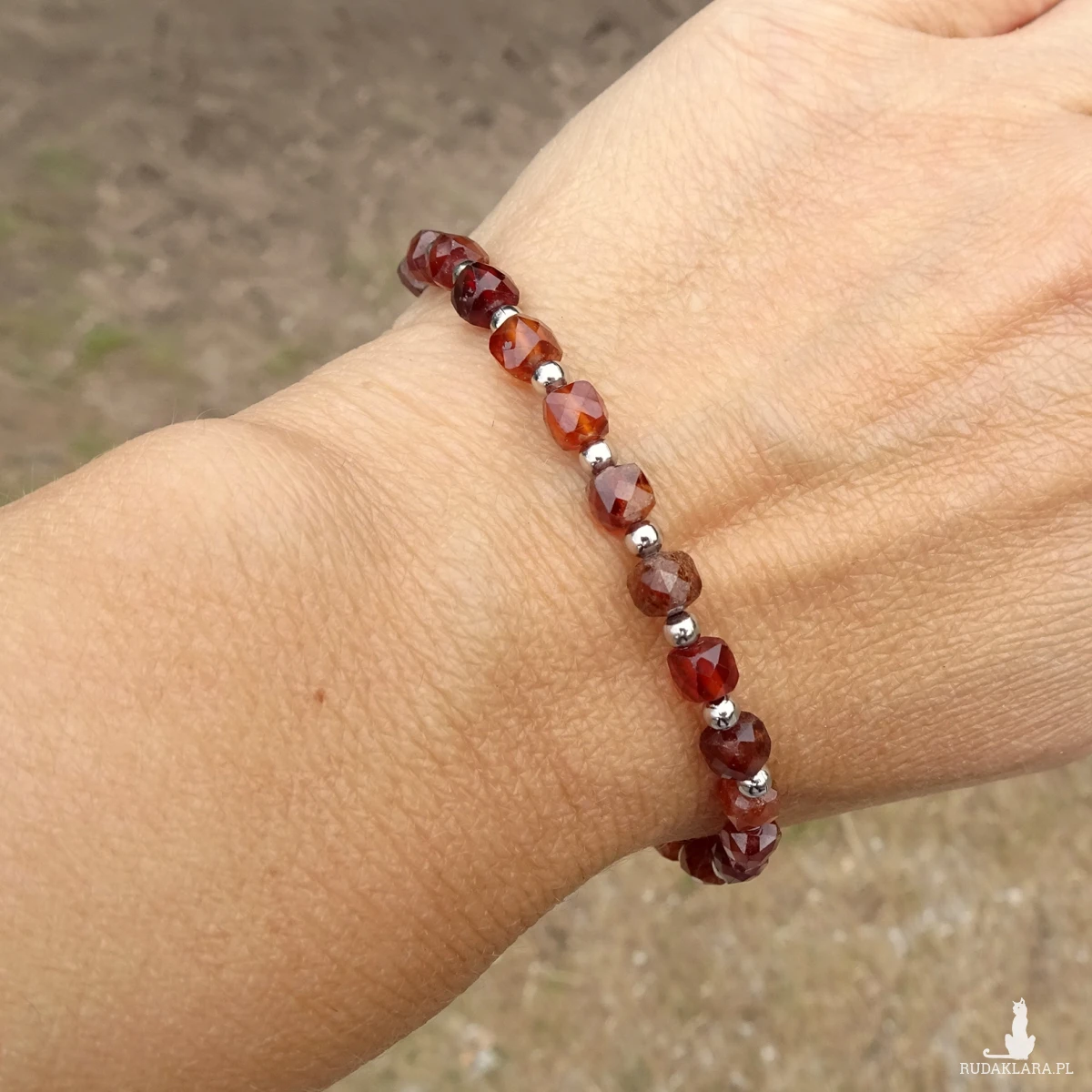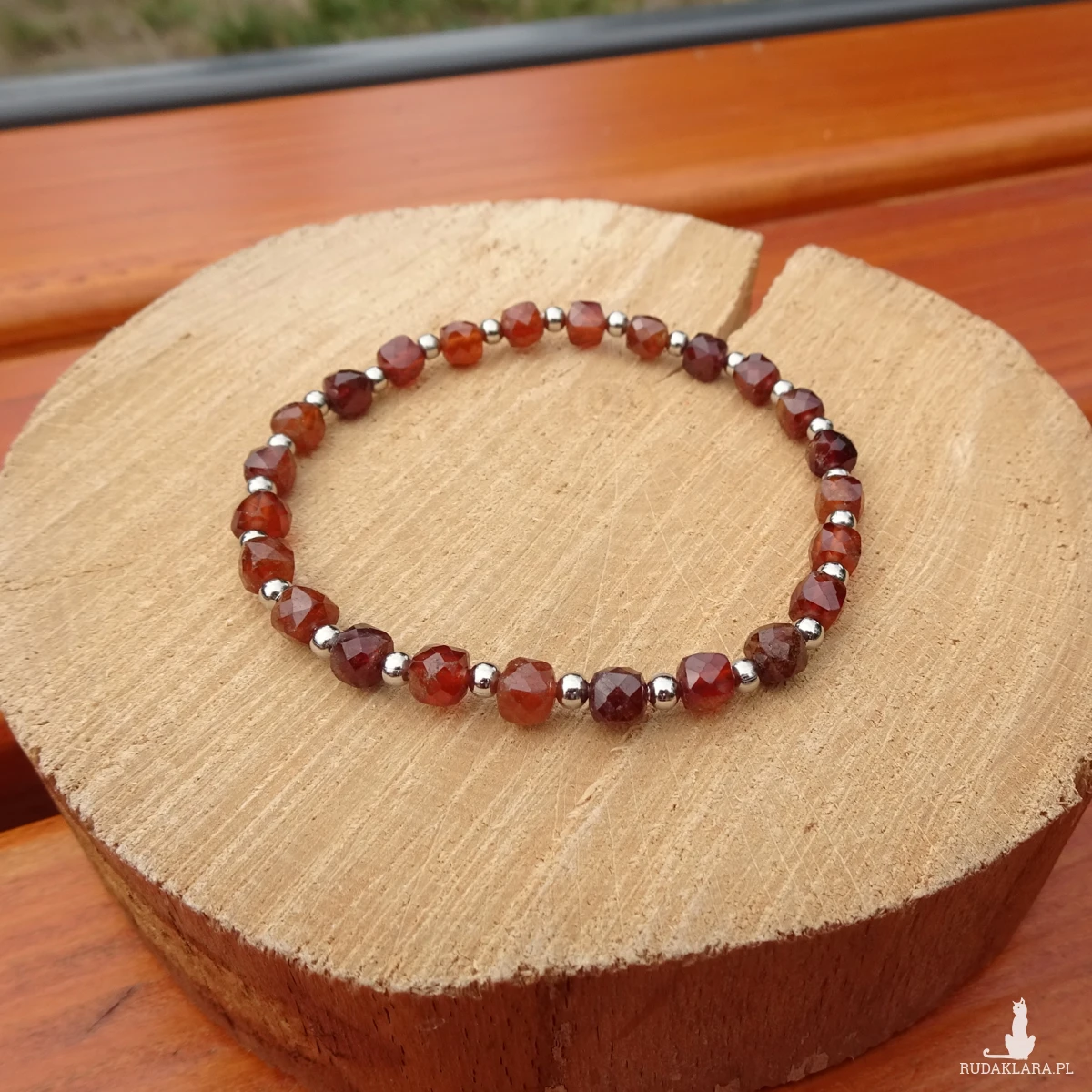 Bransoletka z hessonitu (pomarańczowej odmiany granatu) i kulek ze stali szlachetnej, na silikonowej gumce