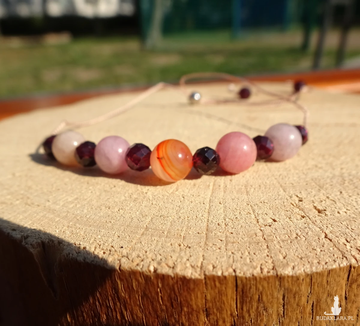 Bransoletka na nici jedwabnej z naturalnych kamieni – agatów, agatów Alashan i fioletowych granatów
