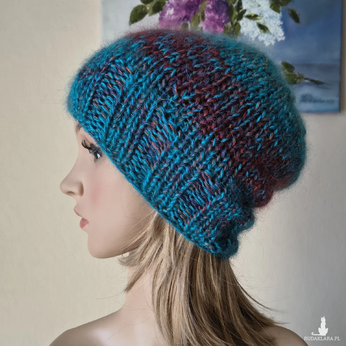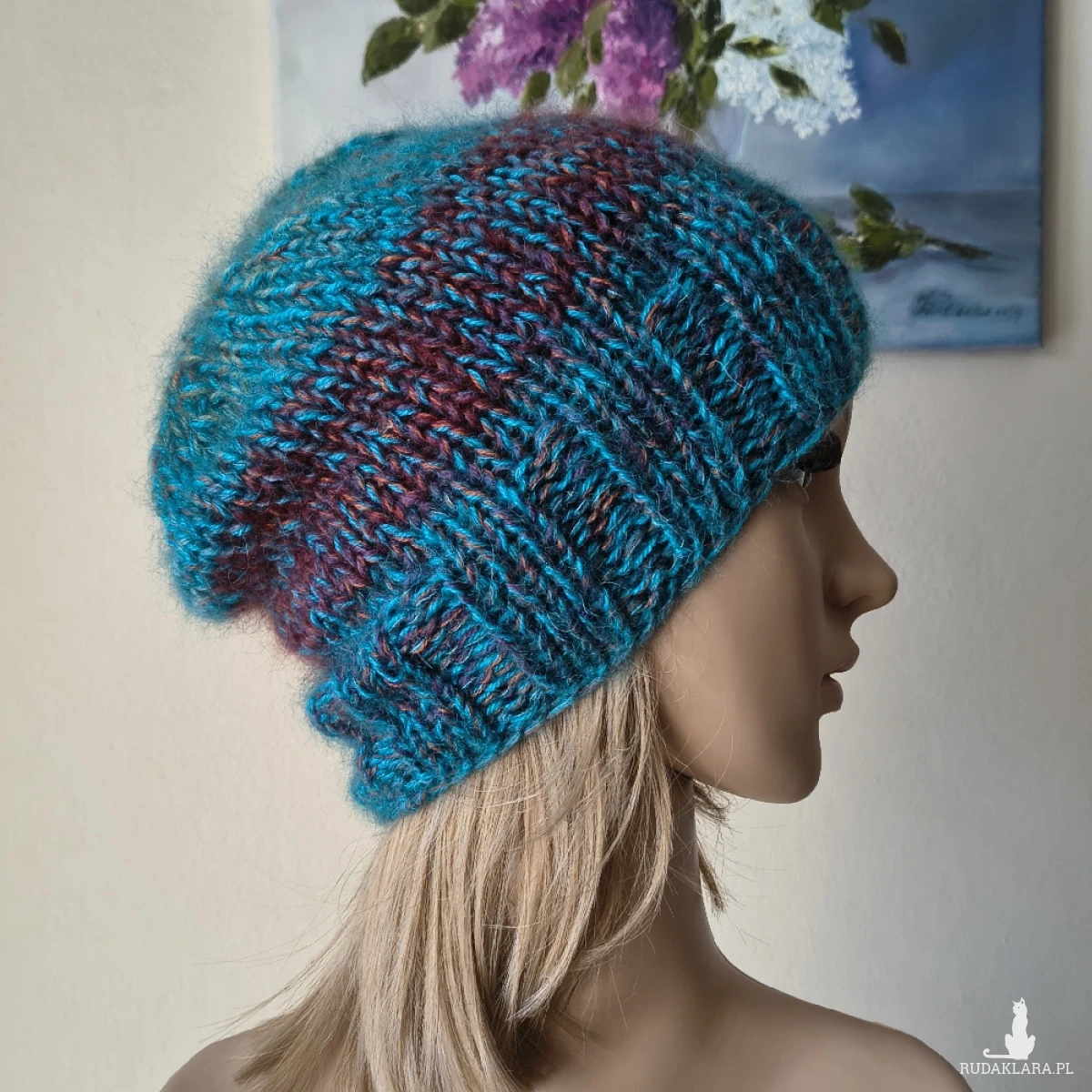 Miła, bezszwowa czapka, wykonana ręcznie na drutach poczwórną nitką z najwyższej jakości włóczek: dwie z nich, to najdelikatniejszy, australijski moher z jedwabiem (70% moher, 30% jedwab), trzecia to urugwajska wełenka merino 100%, czwarta to włóczka akrylowo-wełniana (50%/50%). Czapka jest lekka, delikatnie puchata i ciepła. Niestety zdjęcia nie oddają miękkości i puszystości włóczek, ani ciekawych niuansów kolorystycznych: turkusy, bordo, rdza. Polecam dla obwodów głowy 55-57 cm. Dł. czapki - 26 cm. Pranie - jak w przypadku wszystkich moich wyrobów - wyłącznie ręczne.