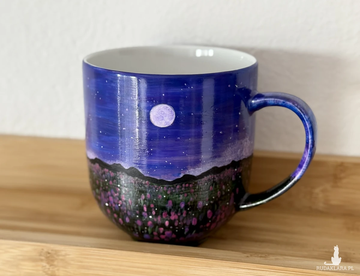 Ręcznie malowany kubek z motywem nocnego krajobrazu górskiego. Jest on wykonany przy użyciu wysokiej jakości farb porcelanowych i wypalony w wysokiej temperaturze. Kubek jest wykonany z porcelany i ma pojemność 550 ml.