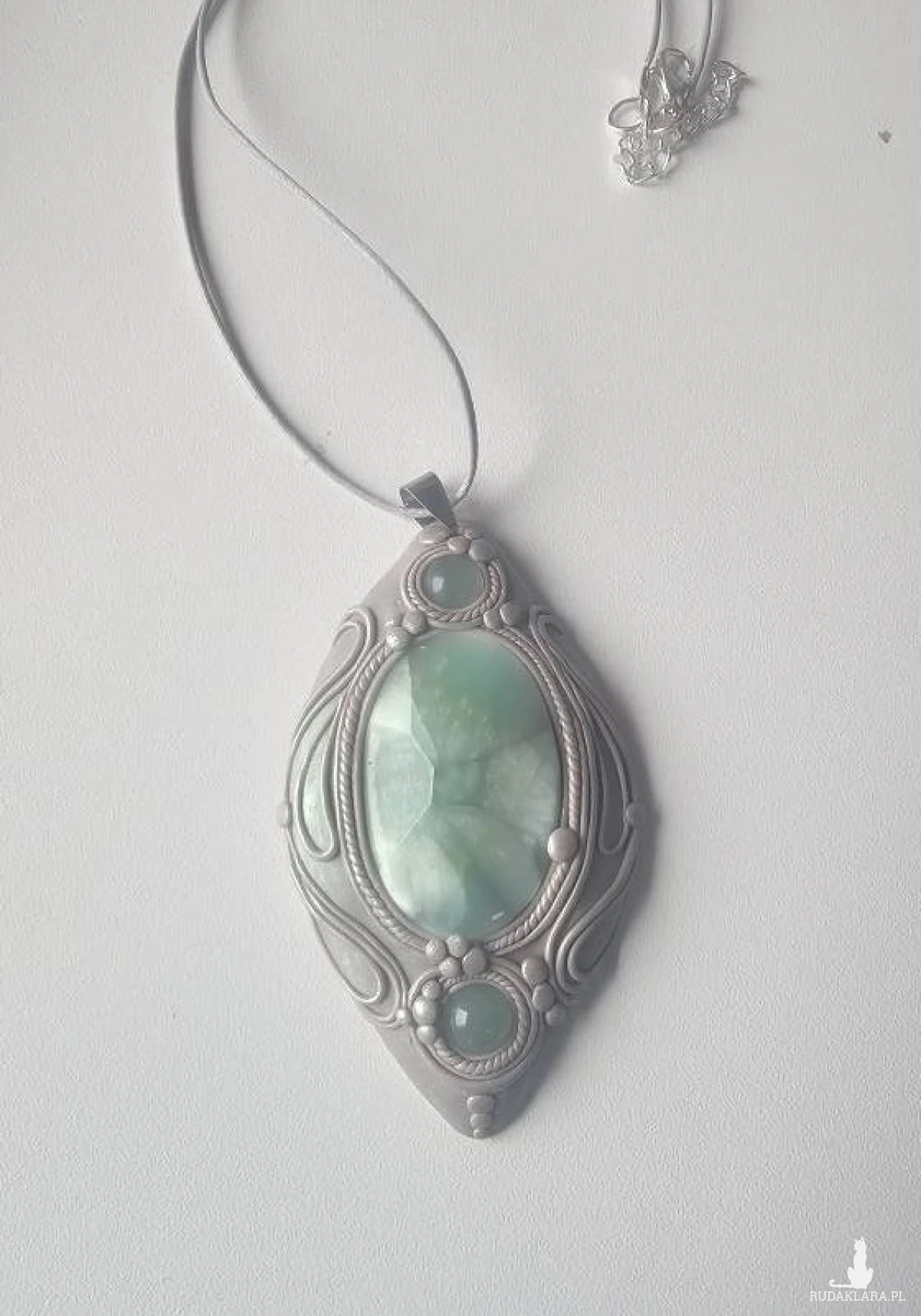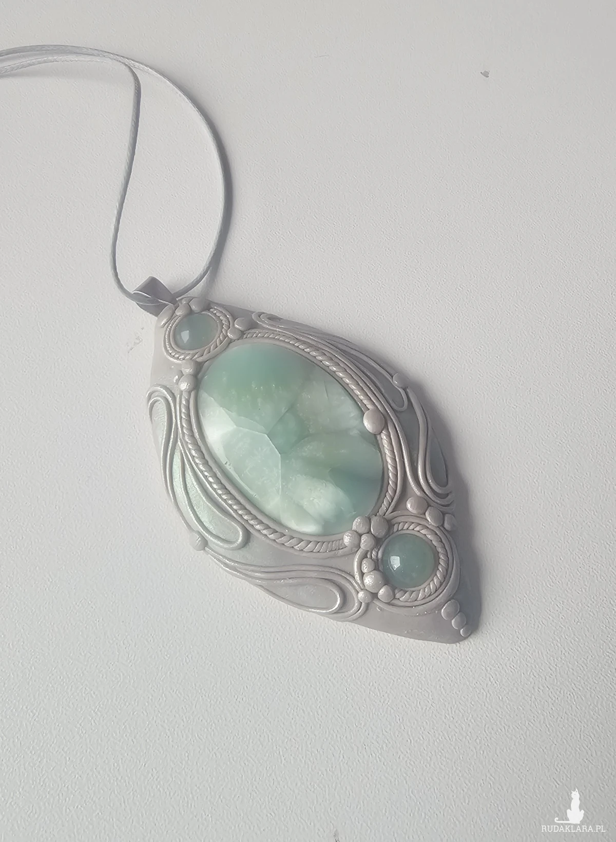 Główny kamień to kaboszon - hemimorfit, kamień z głębią, której piękno ciężko ukazać na zdjęciach. Jakby trójwymiarowy, trochę jakby perłowy w środku. Dwa pozostałe małe kaboszony to akwamaryny. Tło wisiora bardzo lekko połyskuje/opalizuje na zielono. Wisiorek jest na sznurku o długości około 45 cm.