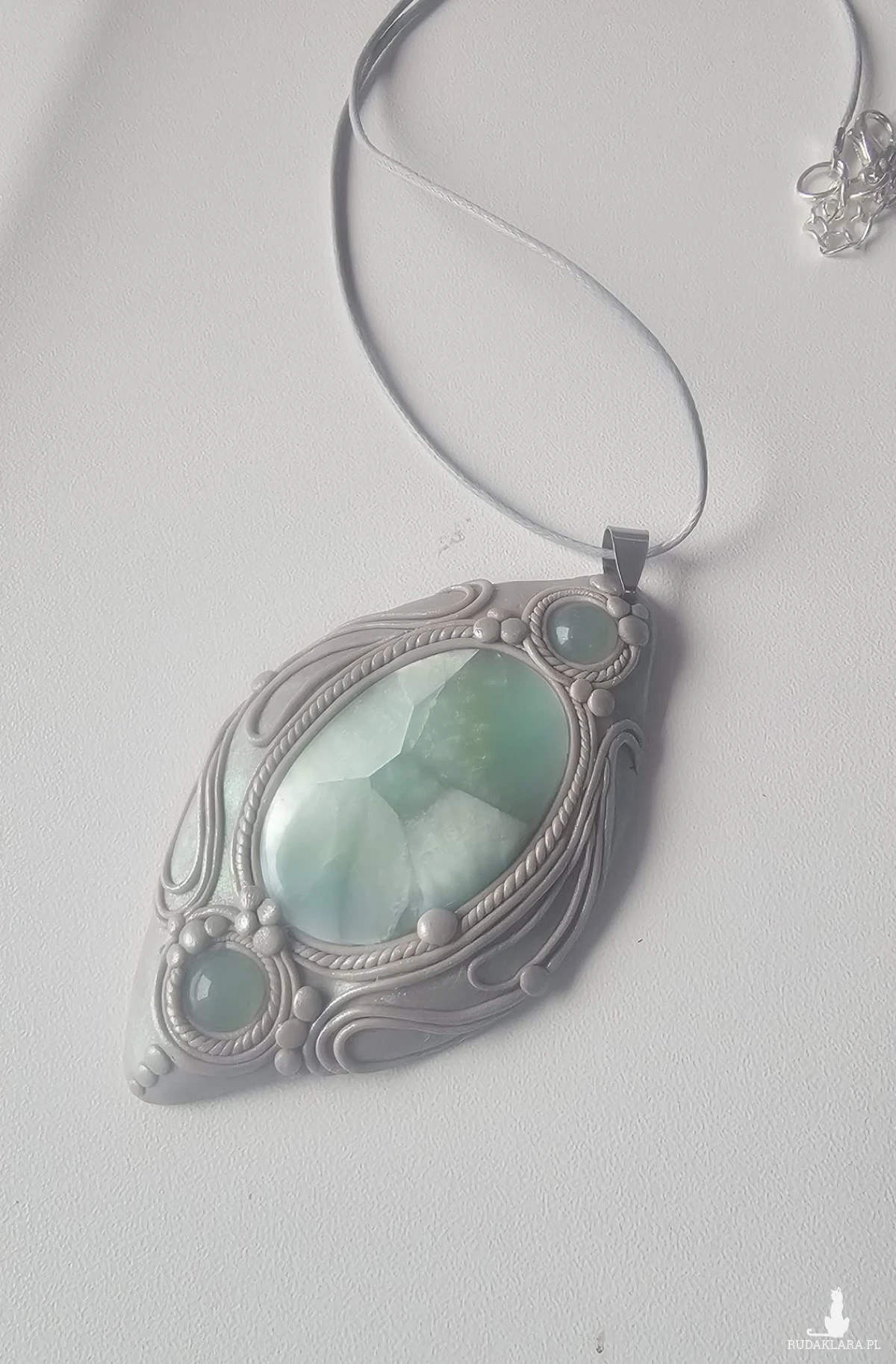 Wisior/naszyjnik/amulet/talizman wykonany misternie z gliny polimerowej. Ozdobiony filigranami, wzorami nawiązującymi do roślinnych pnączy, elfów czy do wzorów orientalnych.