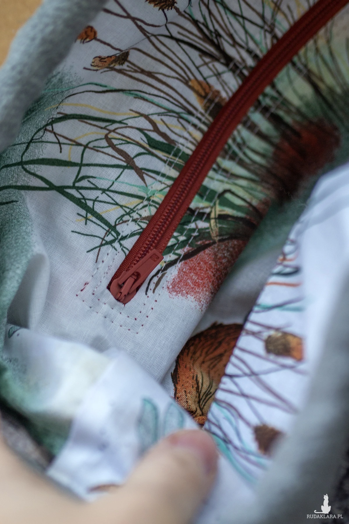 W środku plecak posiada kieszeń zapinaną na suwak. Wykończony jest bawełnianą podszewkę w kapibary.