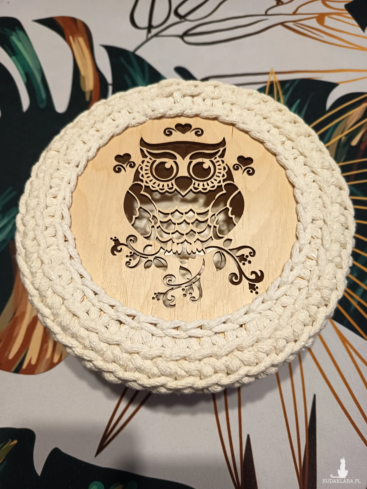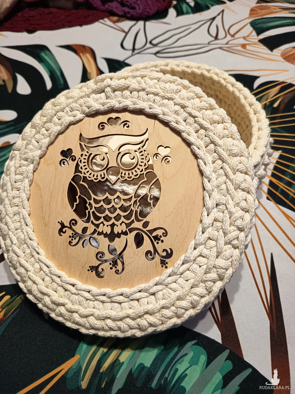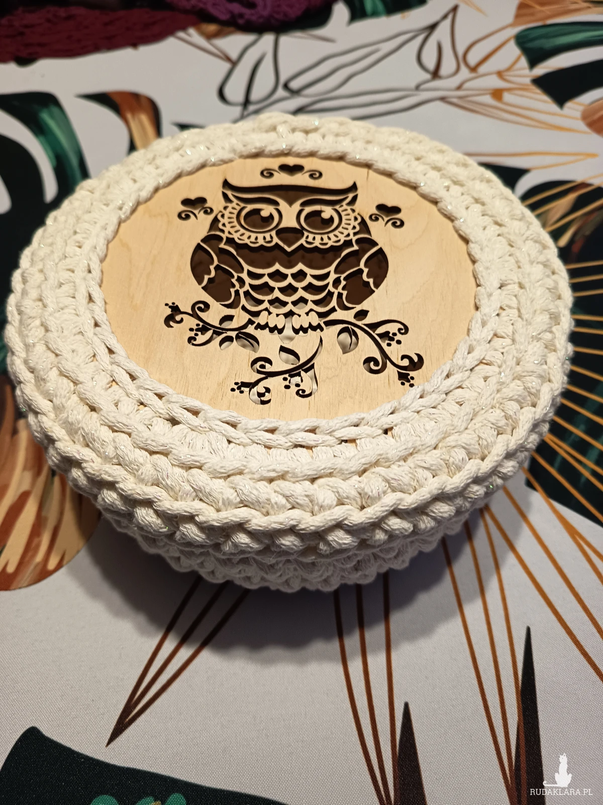 Koszyczek-szkatułka wykonany na szydełku z sznurka bawełnianego na bazie z sklejki. Koszyczek ma wieczko z ozdobnym ażurem. Jest bardzo praktyczne, będzie ozdobą każdego pomieszczenia. Dzięki kolorowi sznurka doda energii pomieszczeniu, w którym go postawimy. Sprawdzi się idealnie jako szkatułka do przechowywania biżuterii lub innych drobiazgów. Idealny dla każdej pani tej małej, czy dużej, młodej czy starej. Wymiary koszyczka średnica 17 cm, a wysokość 6 cm. Kolor tego koszyczka to kremowy z połyskująca nitką. Mogę zrobić koszyczek na zamówienie w innym kolorze.