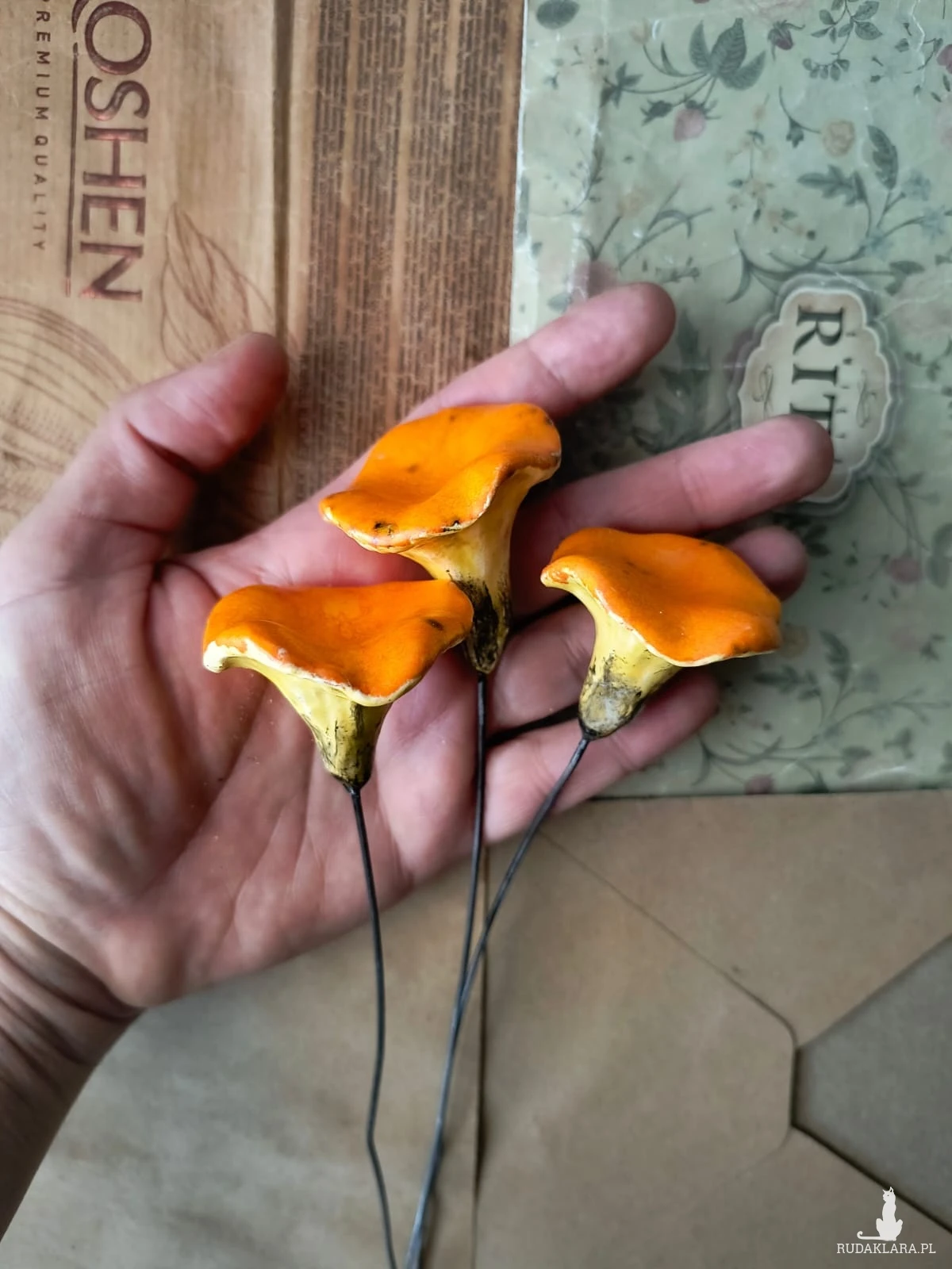 Zestaw 3 grzybków na druciku wykonanych z gliny szamotowej, wypalonych na biskwit, a następnie szkliwionych w temp. ok 1260 stopni C. wymiary ok: 4,5 x 5,5 cm. Serdecznie polecam. Grzybki również dostępne pojedynczo.