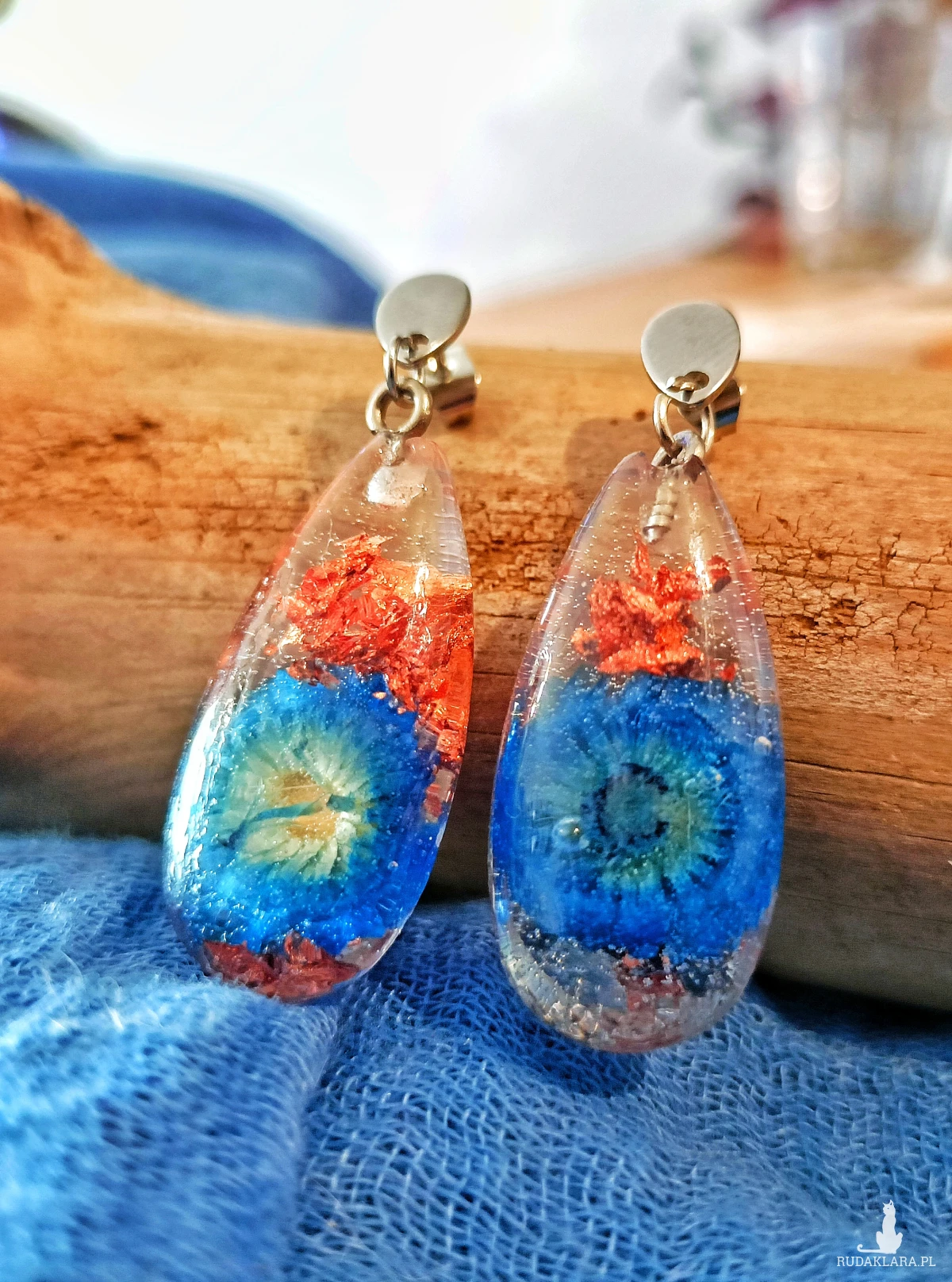 Szukasz biżuterii, która łączy naturalne piękno kwiatów, elegancję i rękodzielniczą precyzję? Te kolczyki w kształcie kropli z prawdziwymi, suszonymi niebieskimi kwiatuszkami kocanki zatopionymi w krystalicznej żywicy Resin Pro zachwycają subtelnym blaskiem i miedzianymi akcentami ✨