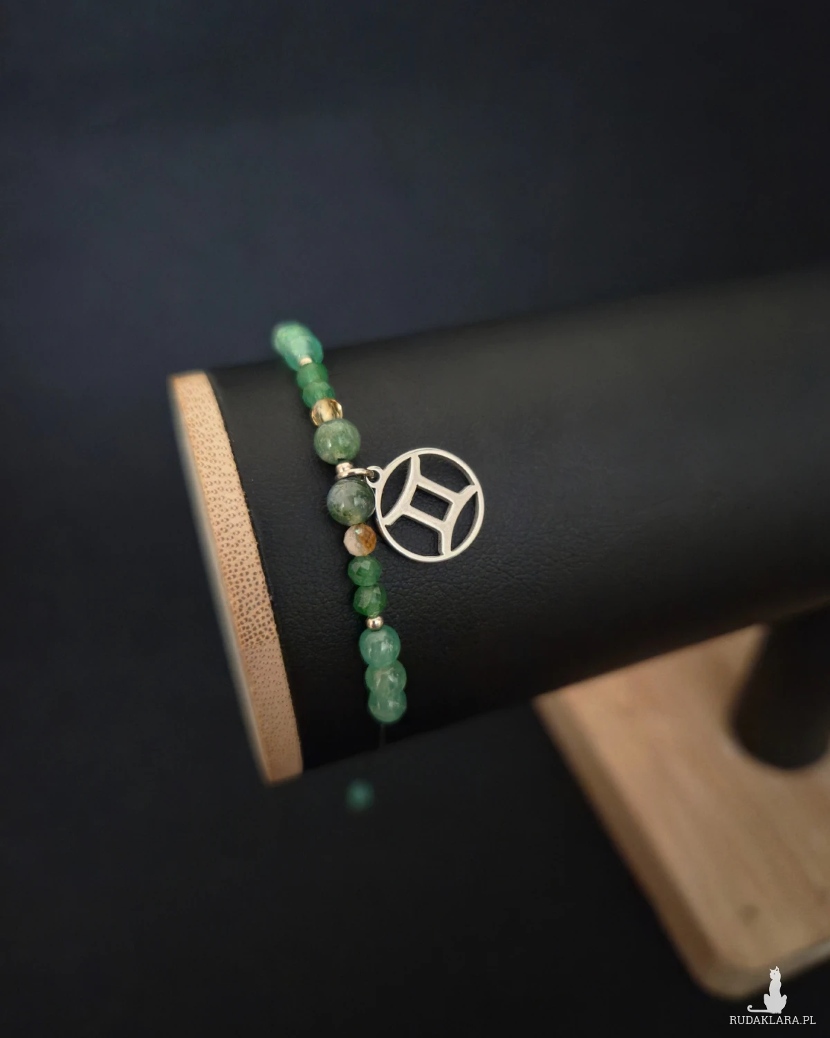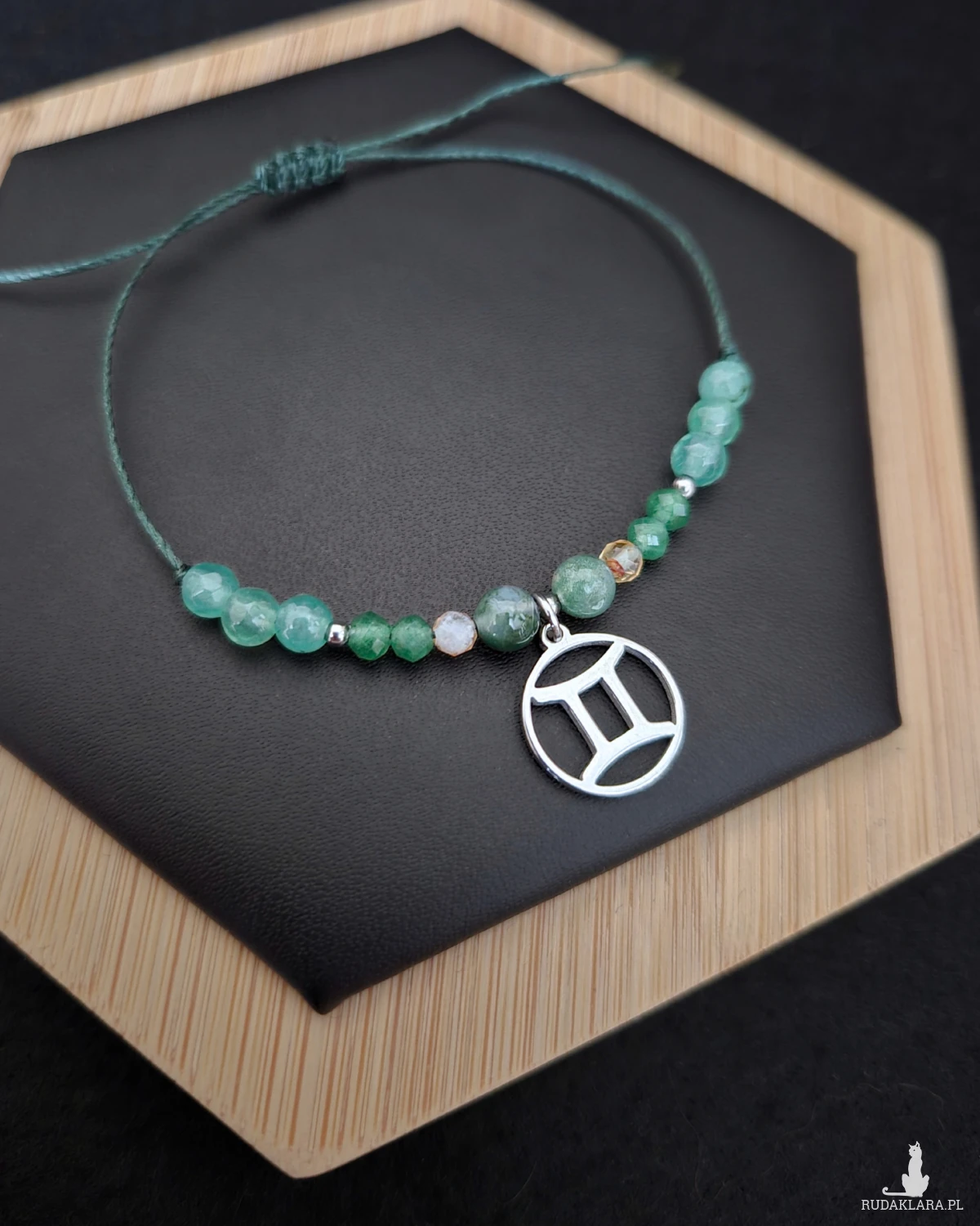 Awenturyn i agat mszysty wprowadzają harmonię, kreatywność i lekkość myślenia, podczas gdy cytryn rozświetla całość energią, optymizmem i radością. Kolorystyka zieleni i delikatnych, ciepłych tonów doskonale oddaje żywiołową, radosną i zmienną naturę Bliźniąt.