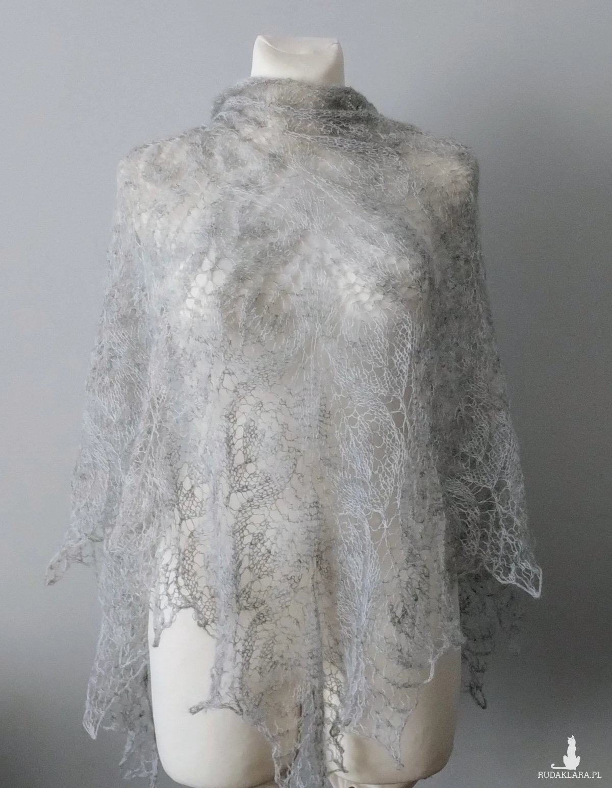 z mieszanki wełny, moheru i akrylu w kolorze jasno szarym.Wymiary: szerokość 210cm, długość 100 cm. Prać ręcznie w temperaturze 30 stopni, suszyć na leżąco .