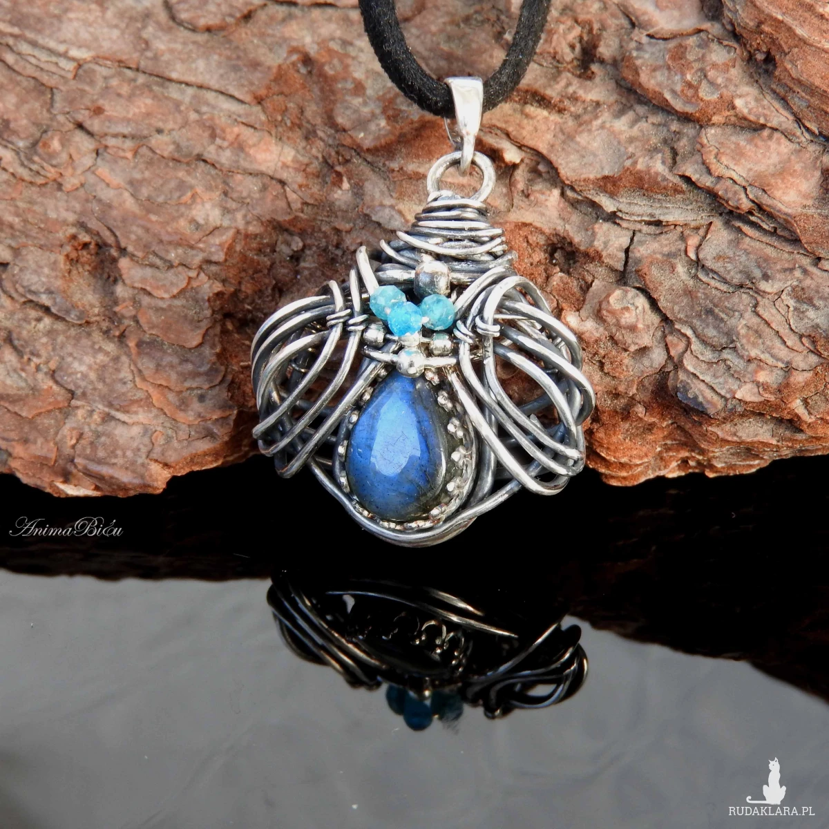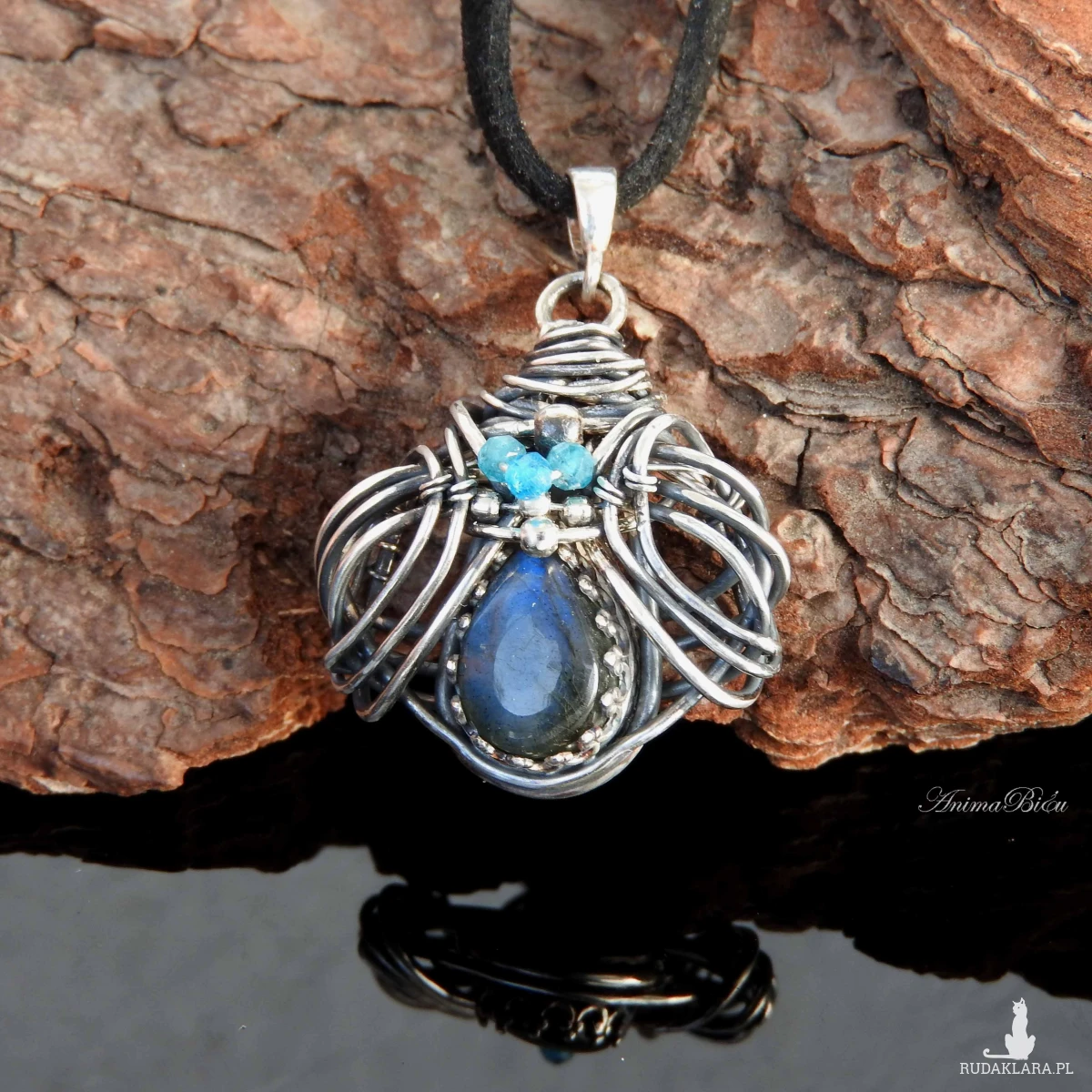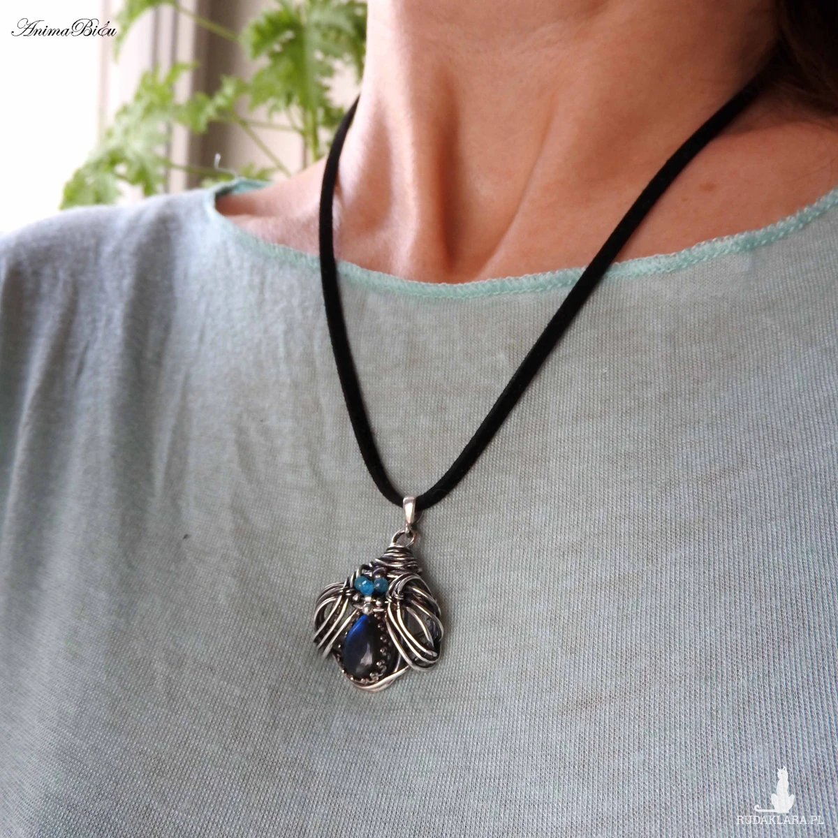 Wisiorek srebrny z labradorytem i apatytami. Wykonany od