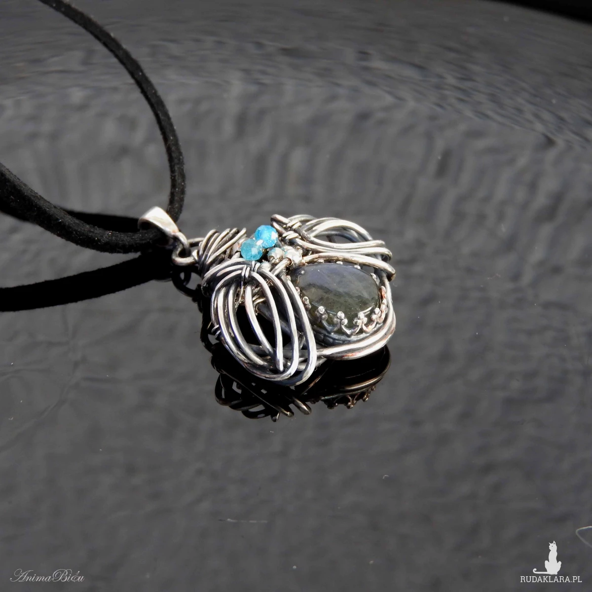kropelka labradorytu o niebieskiej iryzacji. Oprawiłam ją w srebrną koronkę,