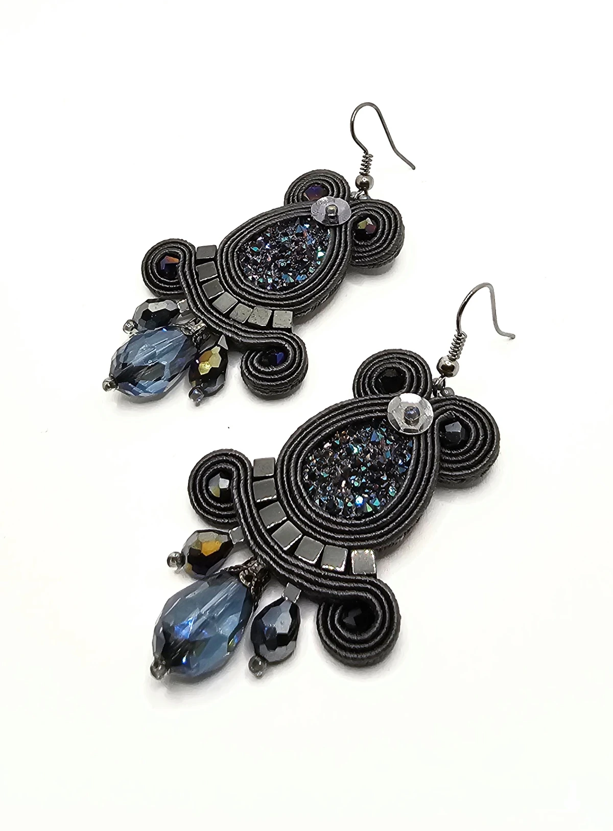 Mieniące się kaboszony z żywicy otoczone sznurkami sutasz oraz kostkami hematytu i niewielkimi kryształami. Dół kolczyków zdobią szklane kryształowe krople. Kolczyki zawieszone na klasycznych biglach w kolorze ciemnego srebra ze stali chirurgicznej.