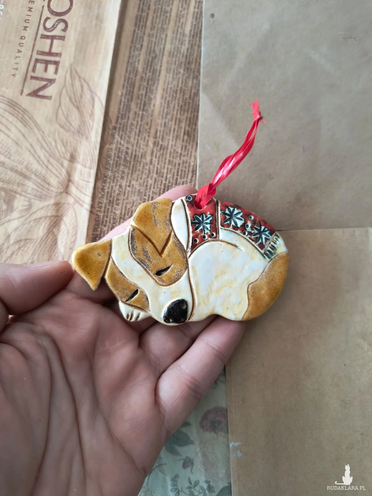 Zawieszka ceramiczna z podobizną pieska rasy Jack Rusell Terrier wykonana z gliny szamotowej, wypalona na biskwit, a następnie szkliwiona w temp. ok 1260 stopni C. Wymiary ok 5 cm x 8,5 cm. Polecam serdecznie wszystkim miłośnikom nietuzinkowej biżuterii.