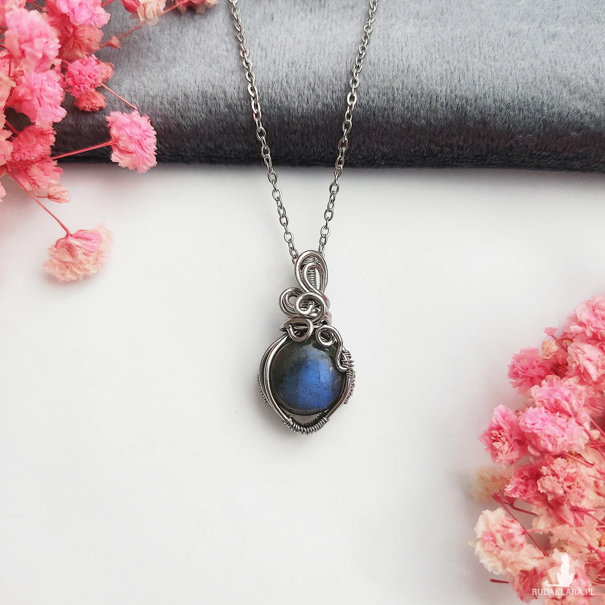 Naszyjnik Labradoryt zapakowany w ozdobne pudełko lub woreczek na biżuterię.