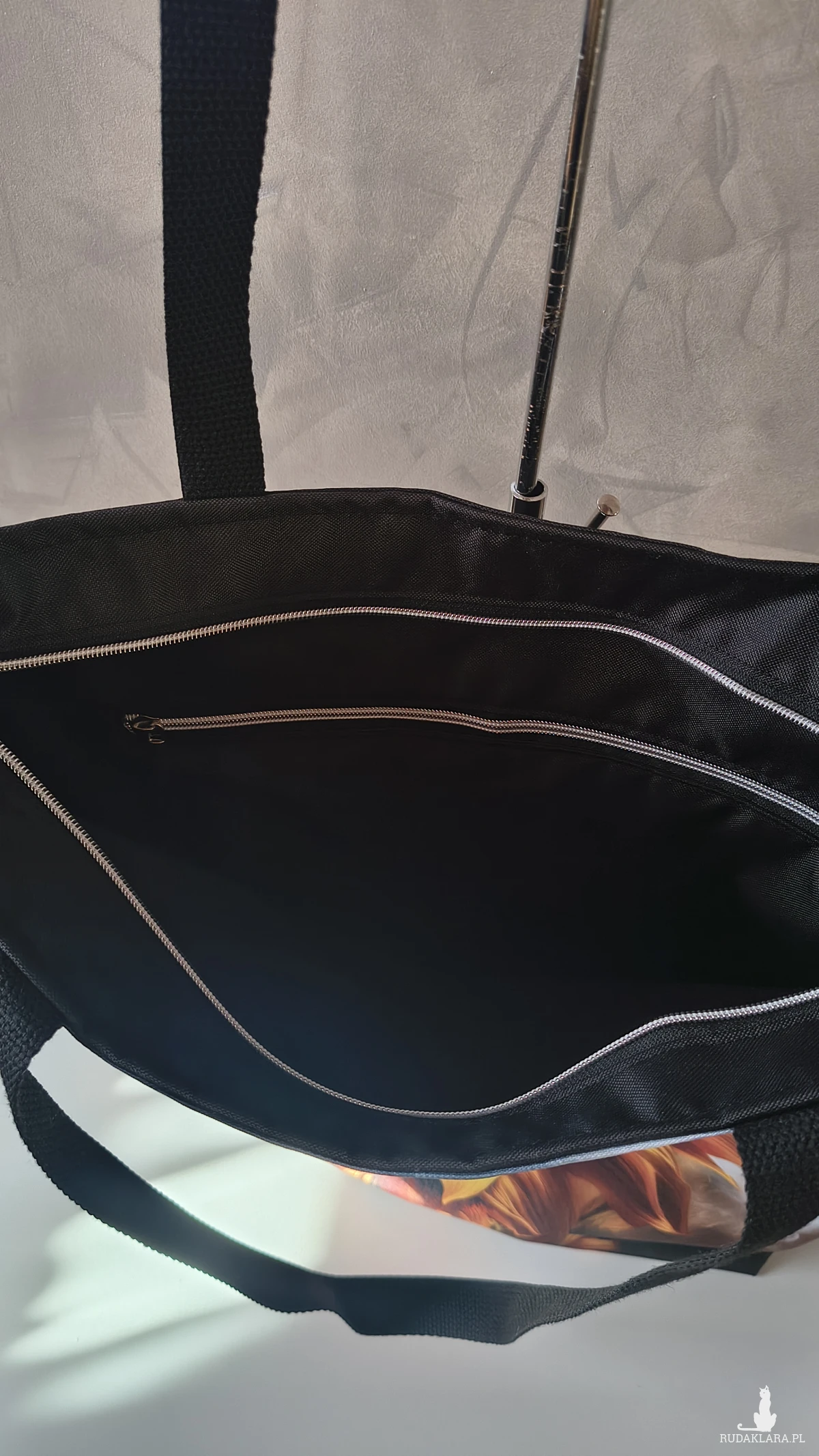 To całkiem spora torba, a do tego wytrzymała Wykonana z materiału wodoodpornego, więc nie straszny jej deszcz czy zabrudzenia. Wewnątrz znajduje się wodoodporna podszewka z kieszonką na zamek. Zapinana na zamek. Na przedniej ścianie panel z pięknym słonecznikiem. Tył torby czarny. .
