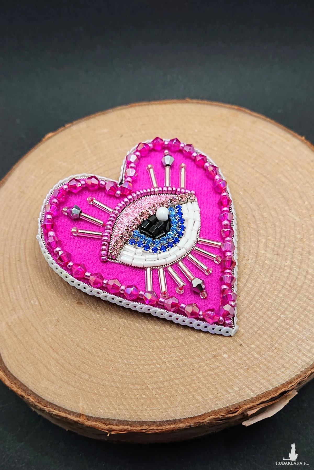 Broszka w kształcie serca z niebieskim okiem. Wykonana z szklanych koralików o różnych kształtach i wielkościach, taśmy z cyrkoniami oraz niewielkich szklanych koralików. Broszka w kolorze intensywnego różu z srebrnymi dodatkami