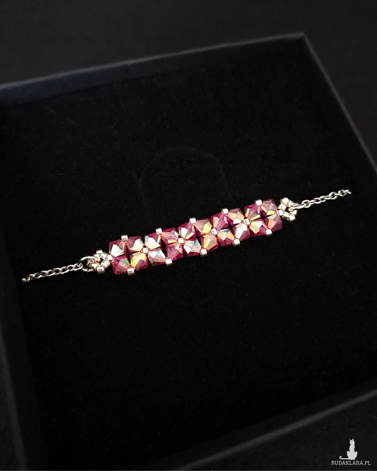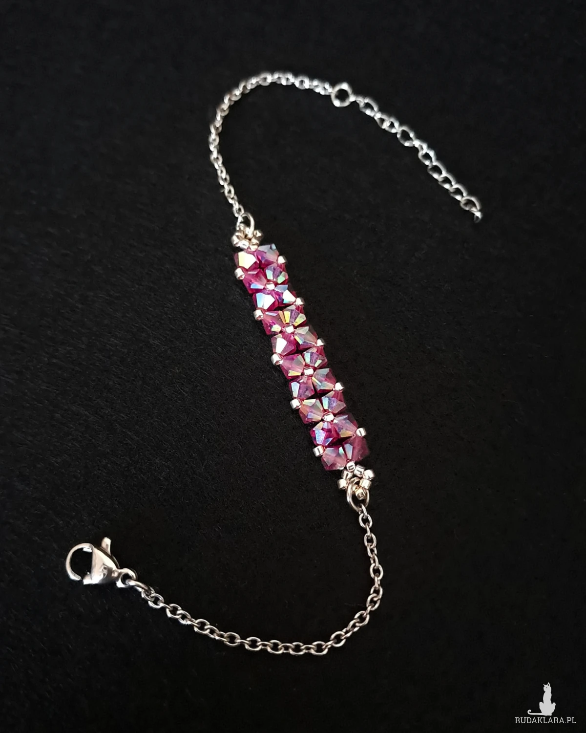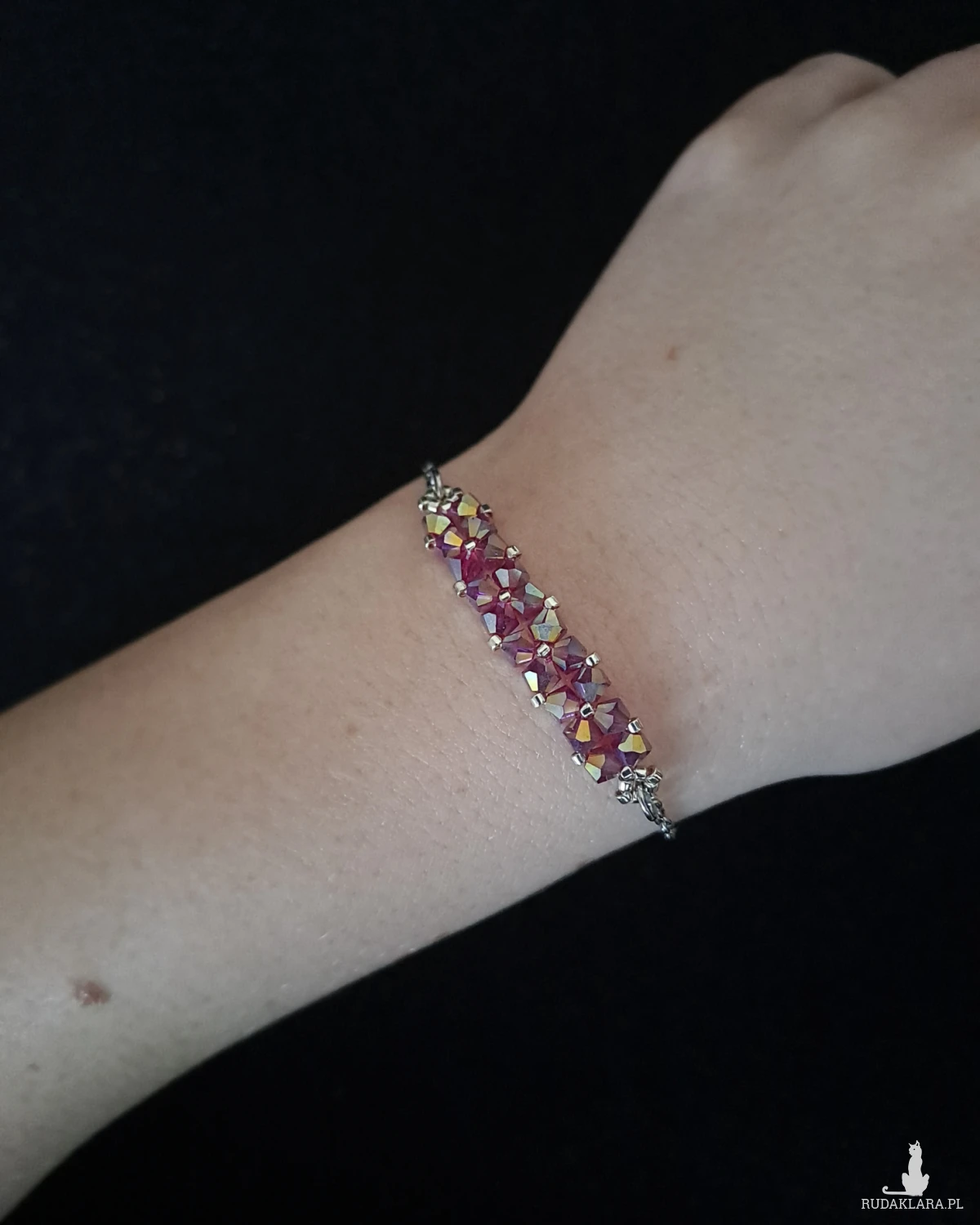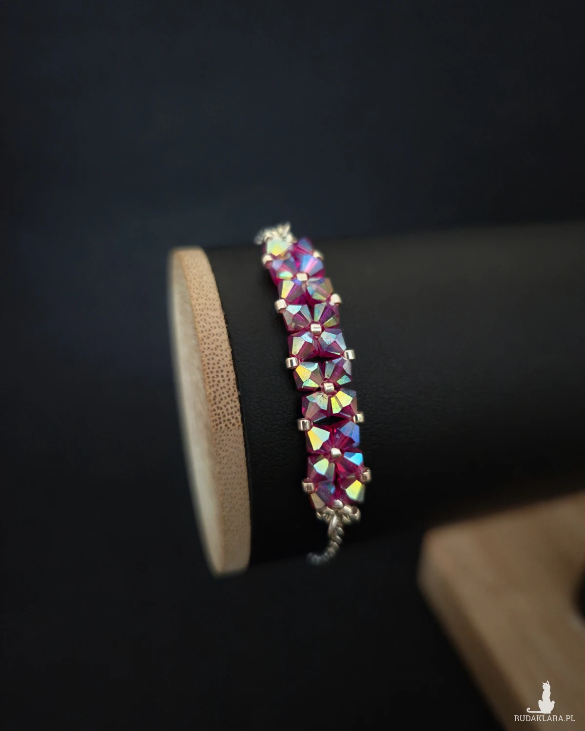 Bransoletka powstaje z kryształków Preciosa w kolorze Fuchsia AB, które dzięki opalizującemu wykończeniu pięknie odbijają światło, ukazując intensywny odcień różu z wielobarwnym, tęczowym połyskiem. Towarzyszą im drobne koraliki Miyuki Delica w srebrnym odcieniu, znane z wyjątkowej regularności i precyzji wykonania.