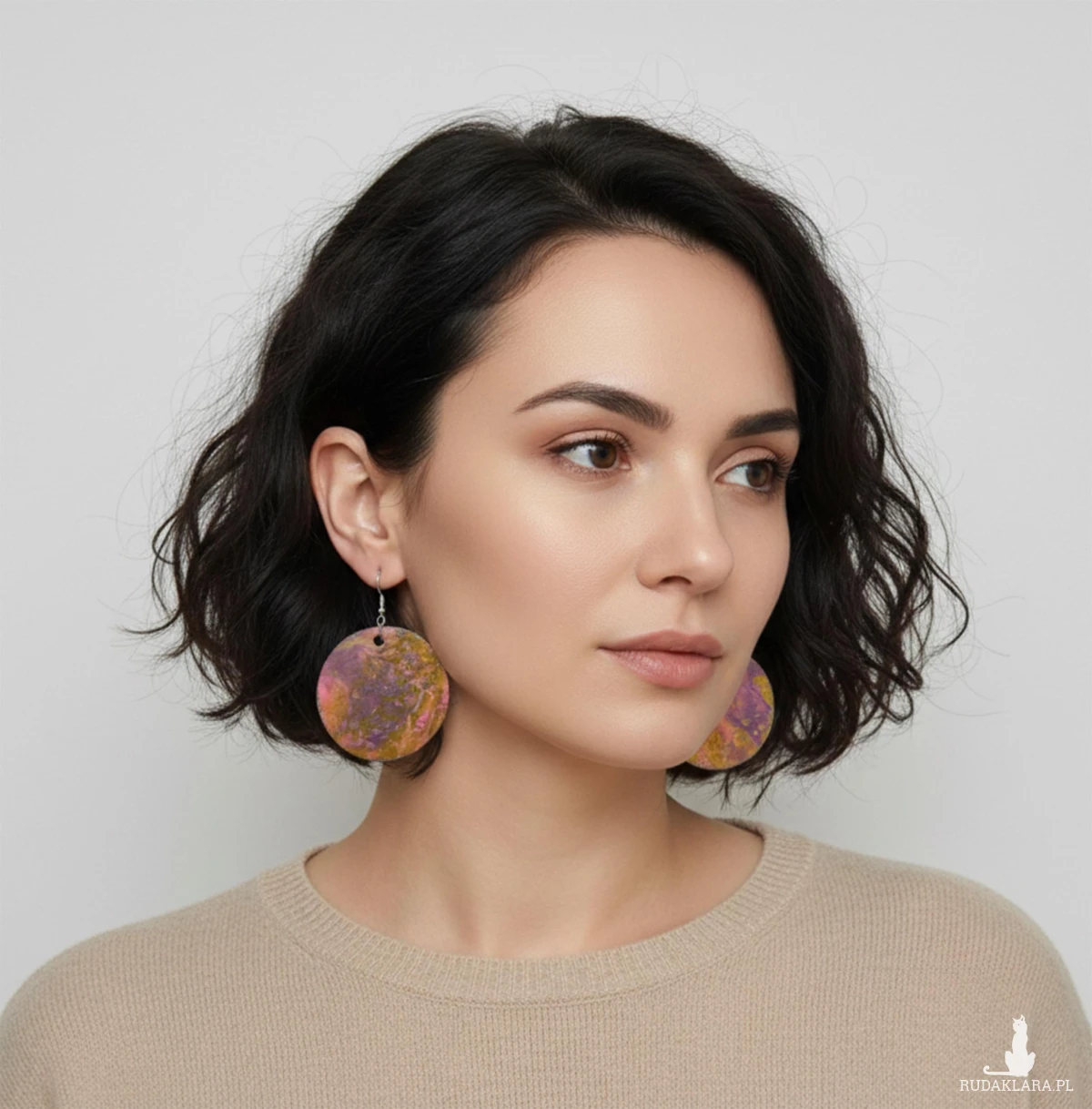 Ręcznie malowane kolczyki-kółka o średnicy 4 cm, stworzone z lekkiej sklejki, to miniaturowe dzieła sztuki, które przyciągają spojrzenia i budzą emocje. Każda para jest niepowtarzalna — każda strona kolczyka ma inny wzór, dzięki czemu nosisz dwa obrazy w jednym.