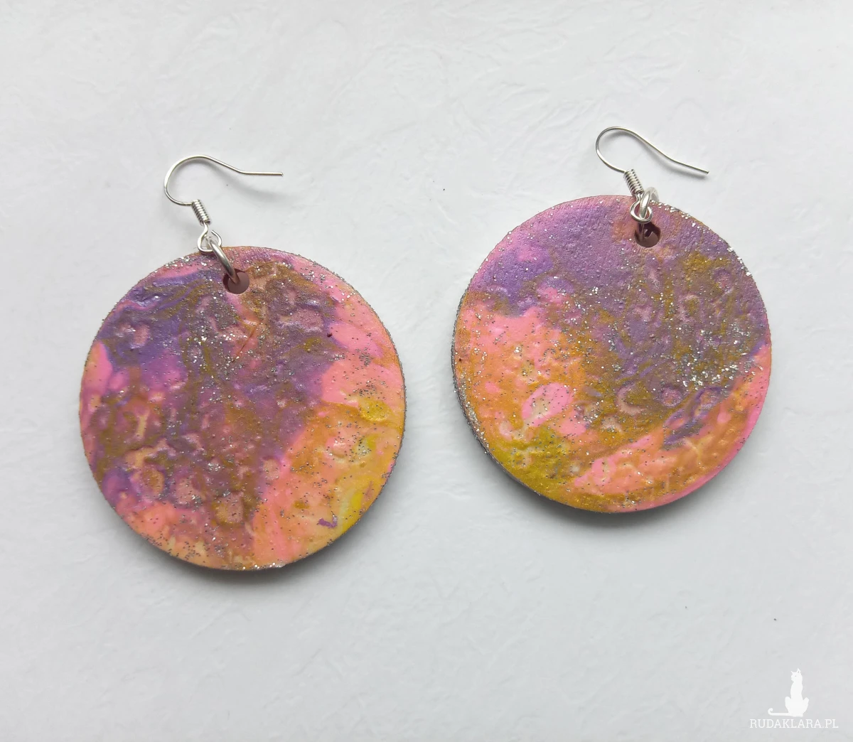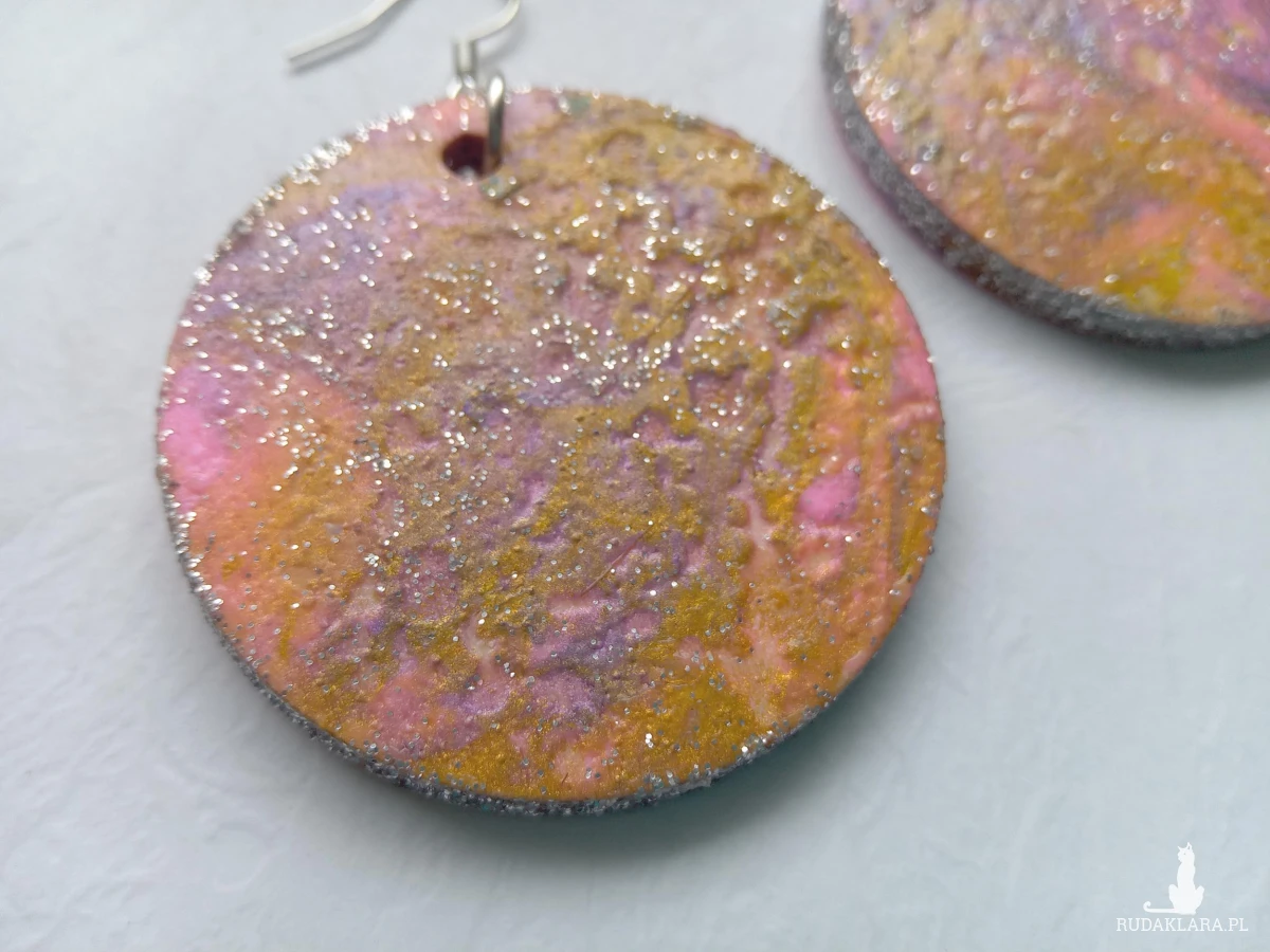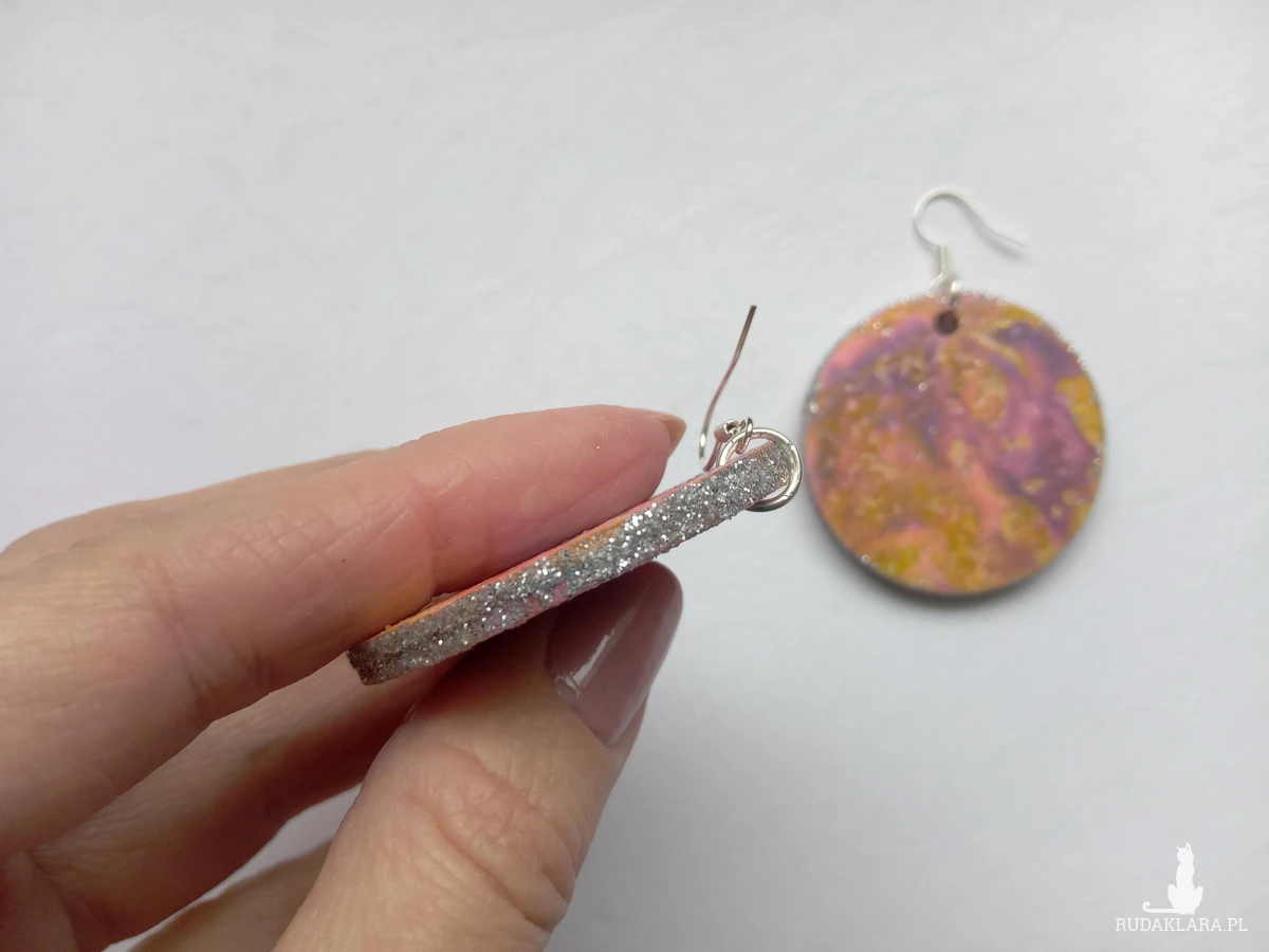 Krawędzie wykończone delikatnym brokatem subtelnie łapią światło przy każdym ruchu — mały detal, wielki efekt. Kolczyki zawieszone są na biglach z metalu antyalergicznego, dzięki czemu są bezpieczne i komfortowe nawet dla wrażliwych uszu.