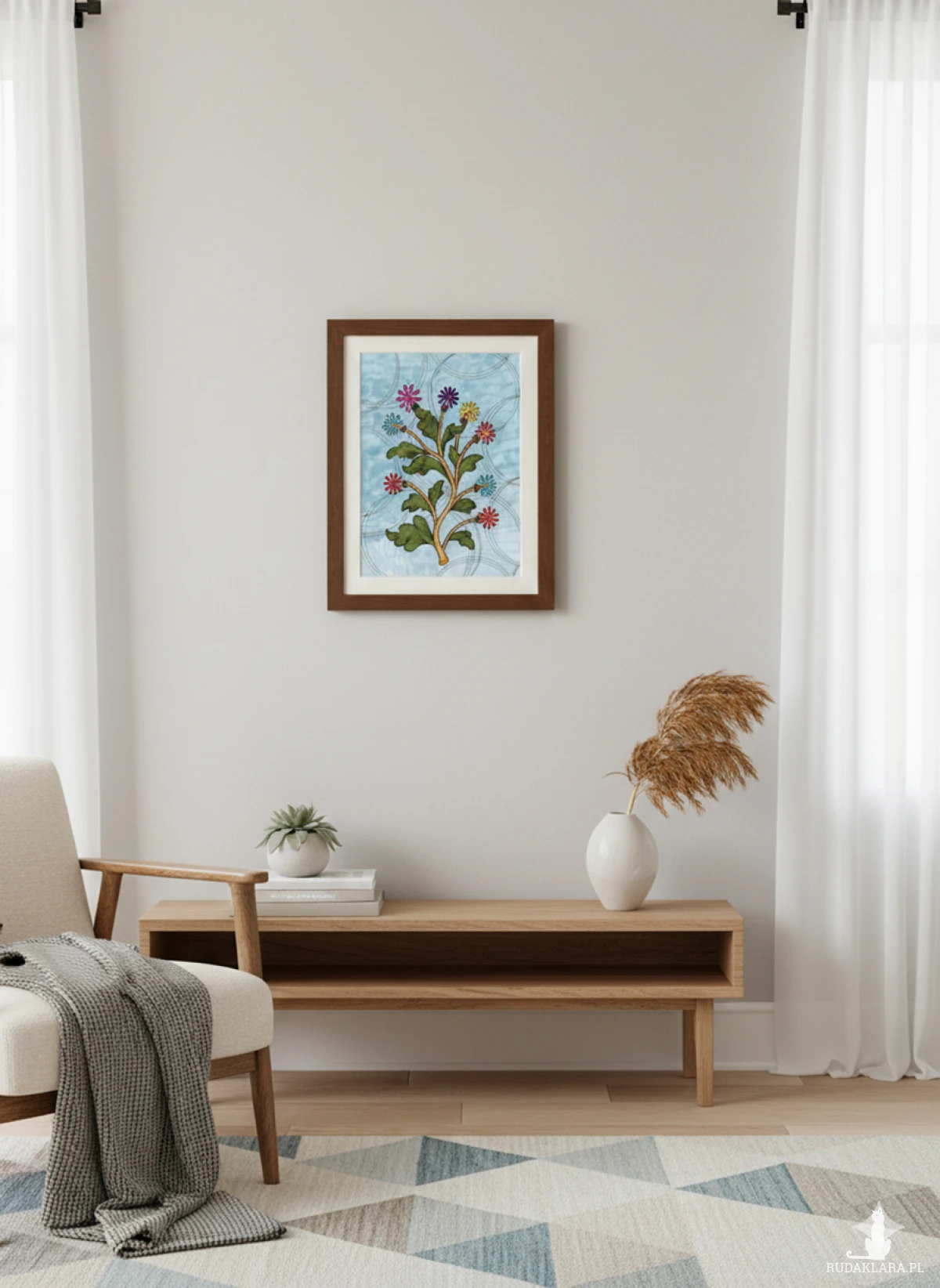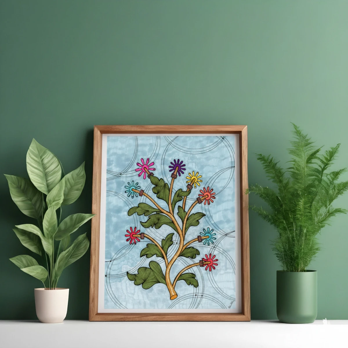 Dobrze zaprezentuje się w metalowej lub minimalistycznej, czarnej ramie na tle surowego betonu lub cegły.