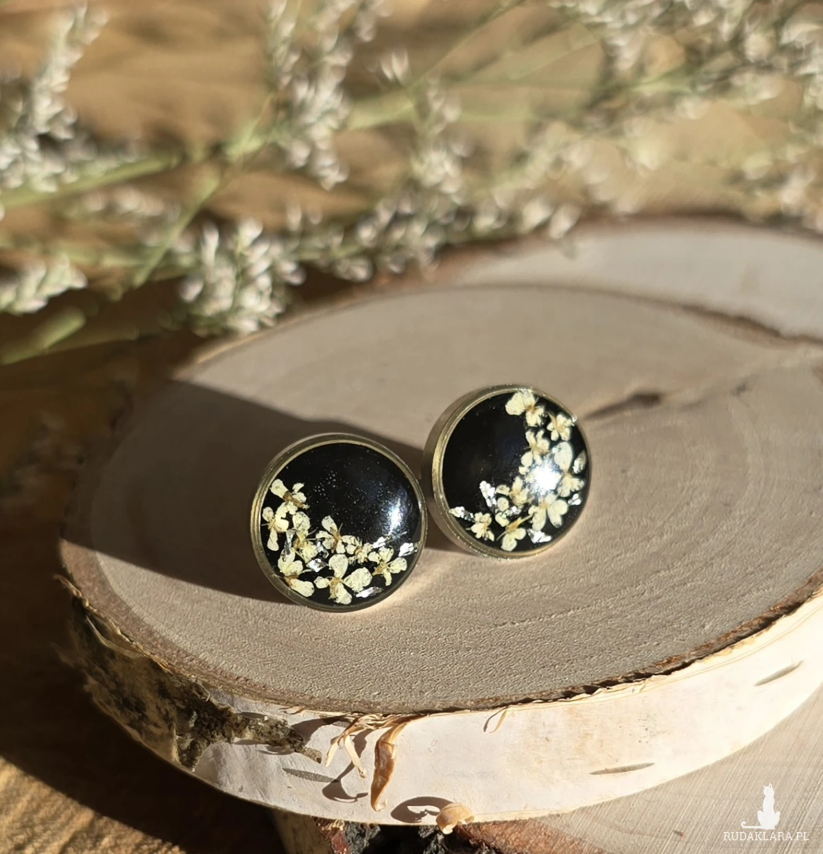 Srebrne kolczyki z kwiatami wkręty sztyfty z żywicy żywica epoksydowa z suszonymi prawdziwymi czarne