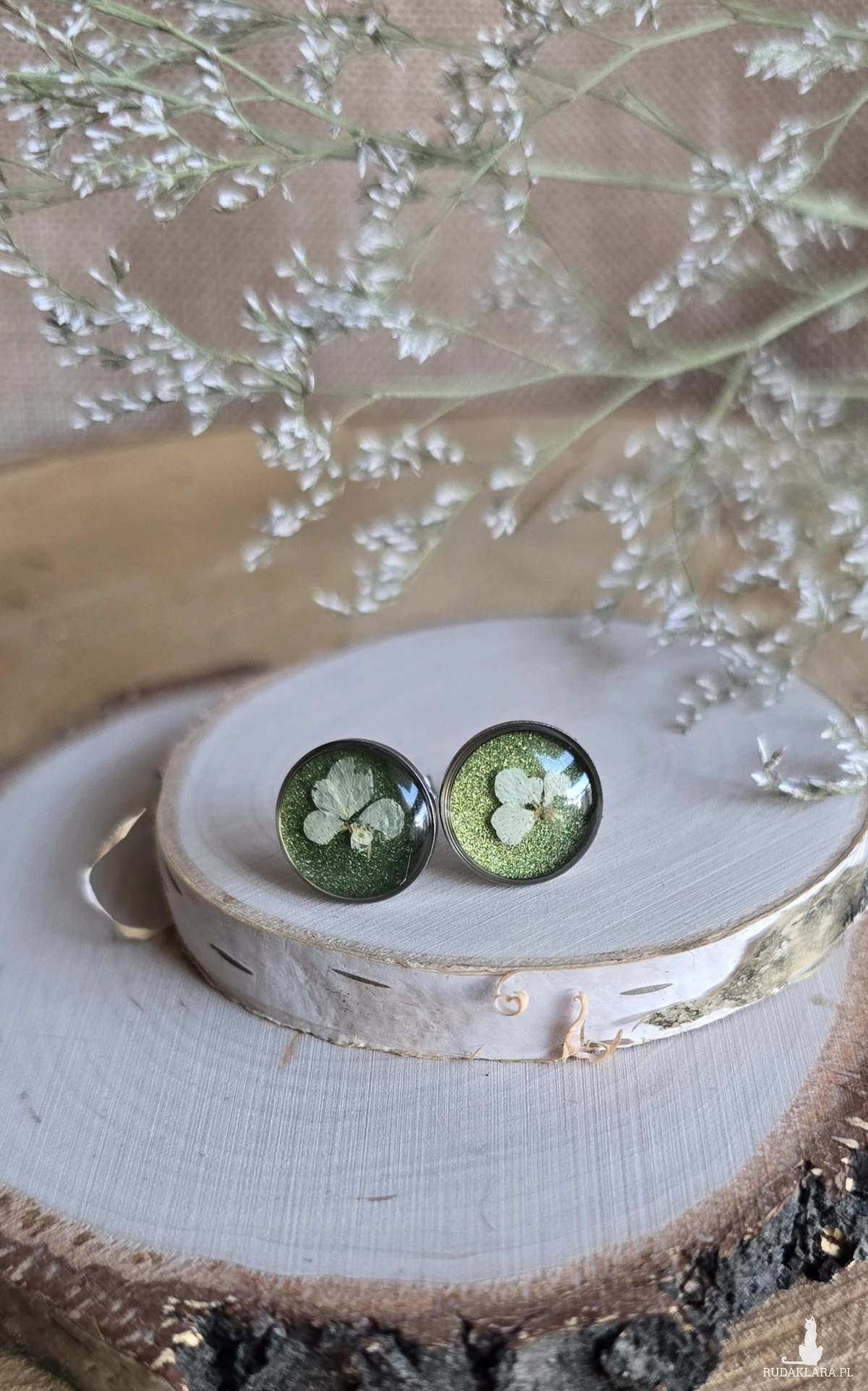 Srebrne kolczyki z kwiatami wkręty sztyfty z żywicy żywica epoksydowa z suszonymi prawdziwymi kwiatami zielone dzika marchew brokat
