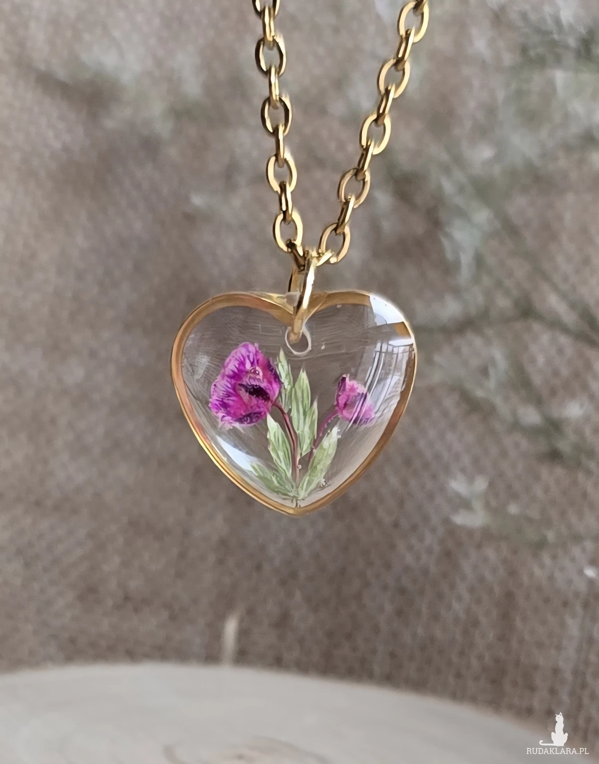 Oferuję Państwu unikalną biżuterię. Zawieszka jest wykonana z suszonych kwiatów i żywicy epoksydowej. Biżuteria jest wspaniałym i oryginalnym prezentem na lata.