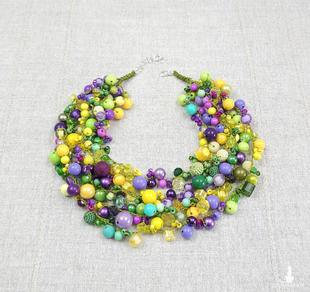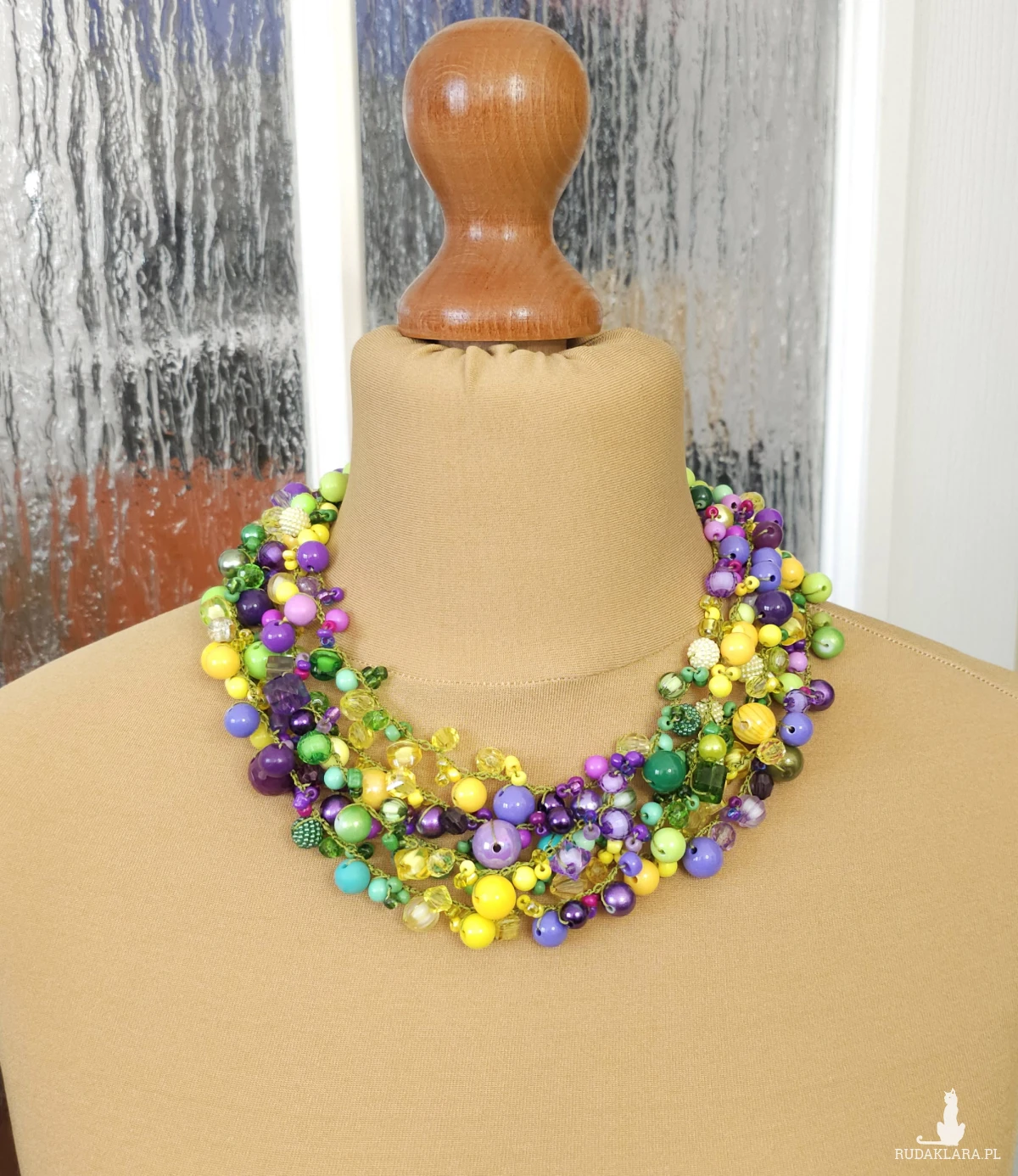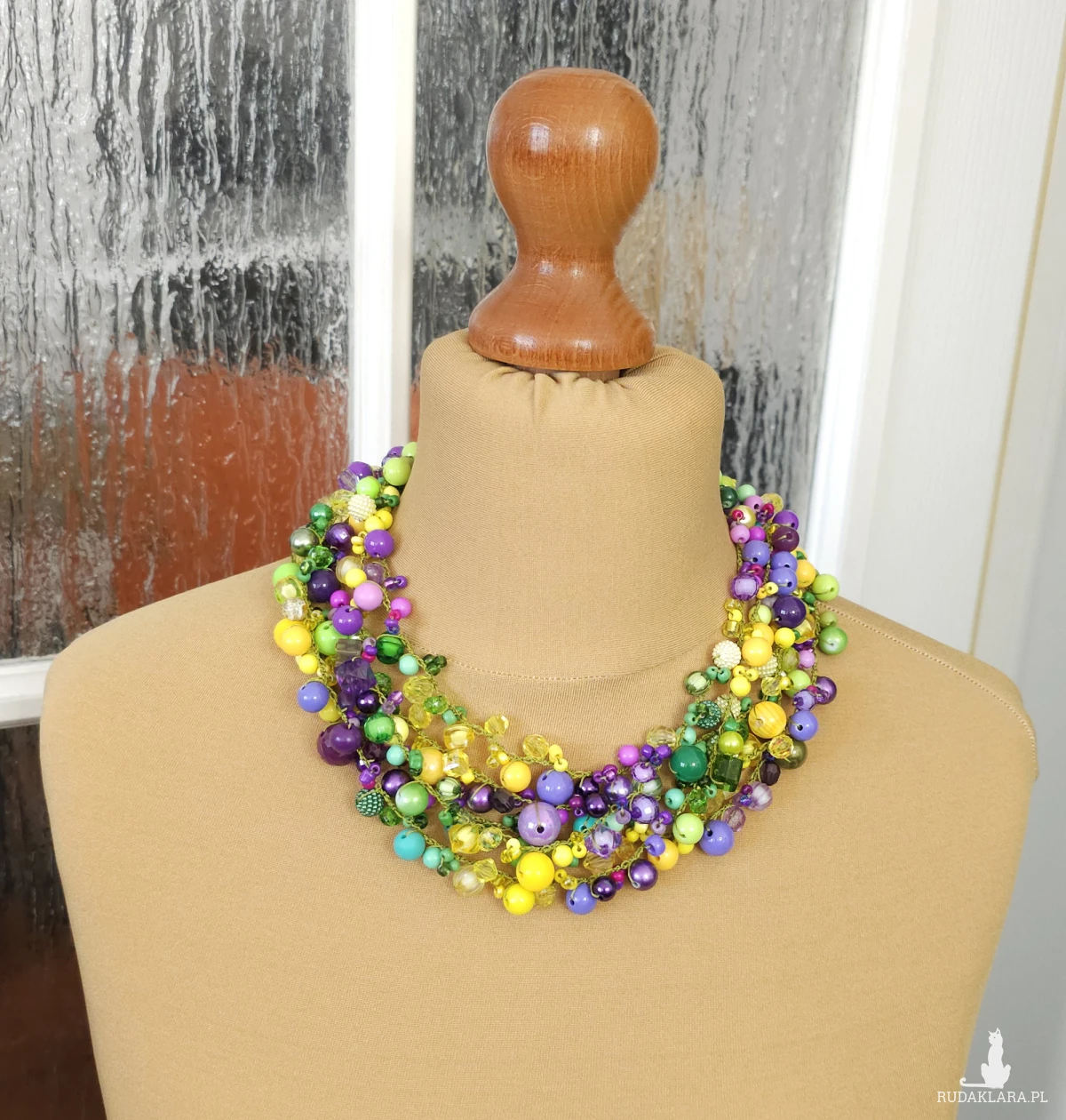 Ten biżuteryjny projekt to starannie skomponowana mieszanka koralików o różnych kształtach, wielkościach i fakturach. Dominujące odcienie energetycznej limonki, słonecznej żółci