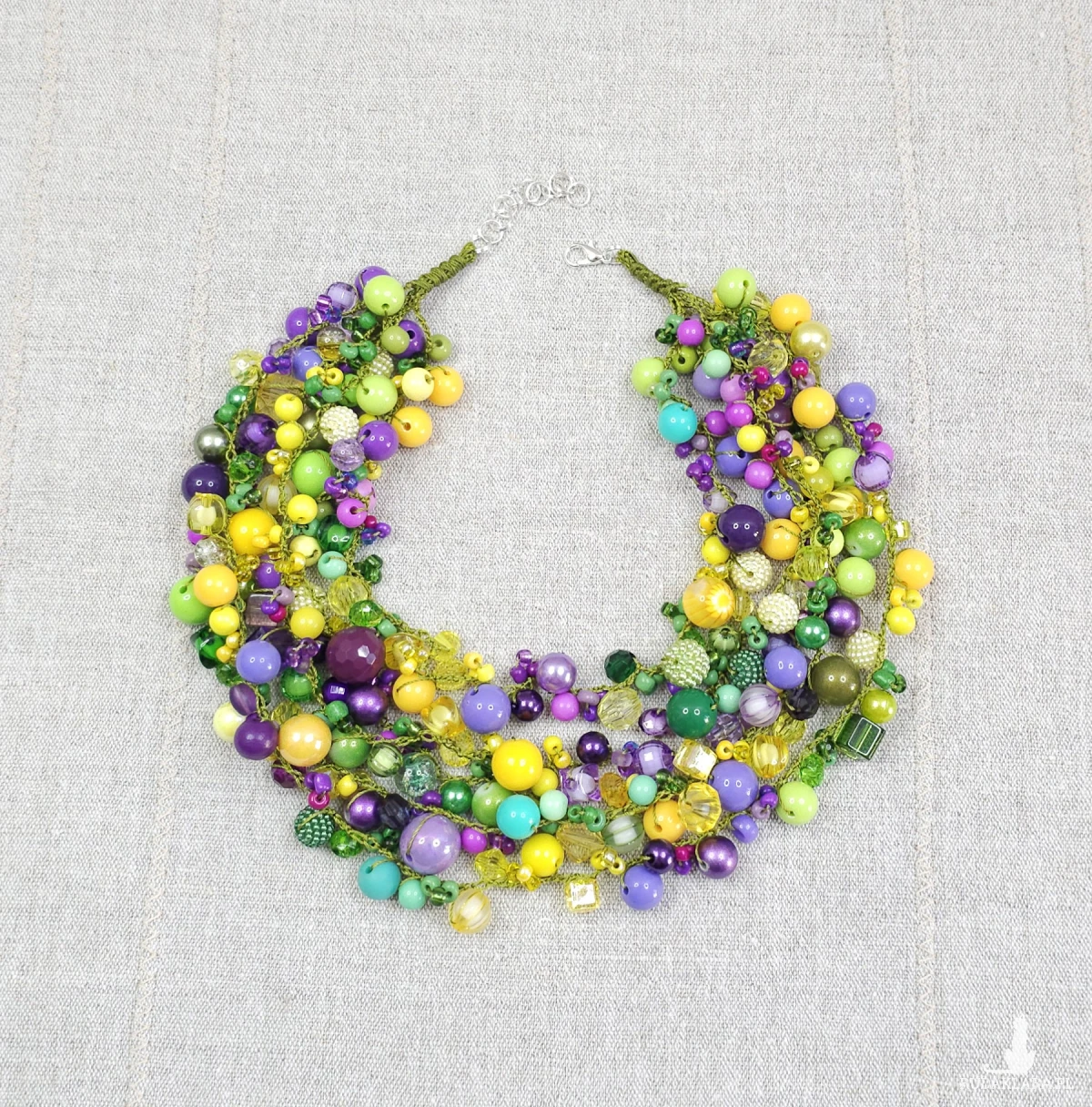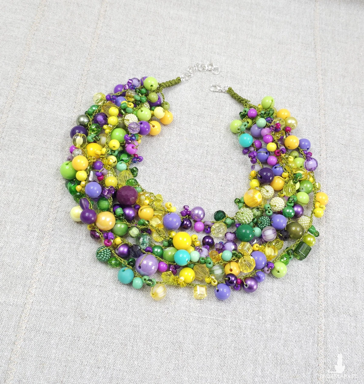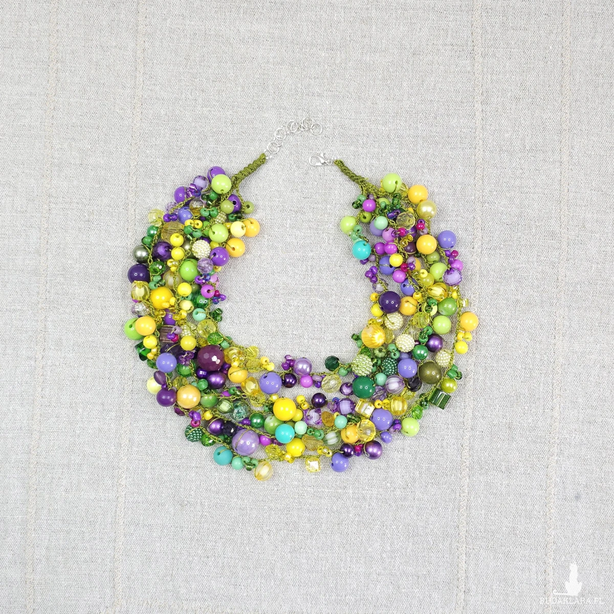 Ten biżuteryjny projekt to starannie skomponowana mieszanka koralików o różnych kształtach, wielkościach i fakturach. Dominujące odcienie energetycznej limonki, słonecznej żółci