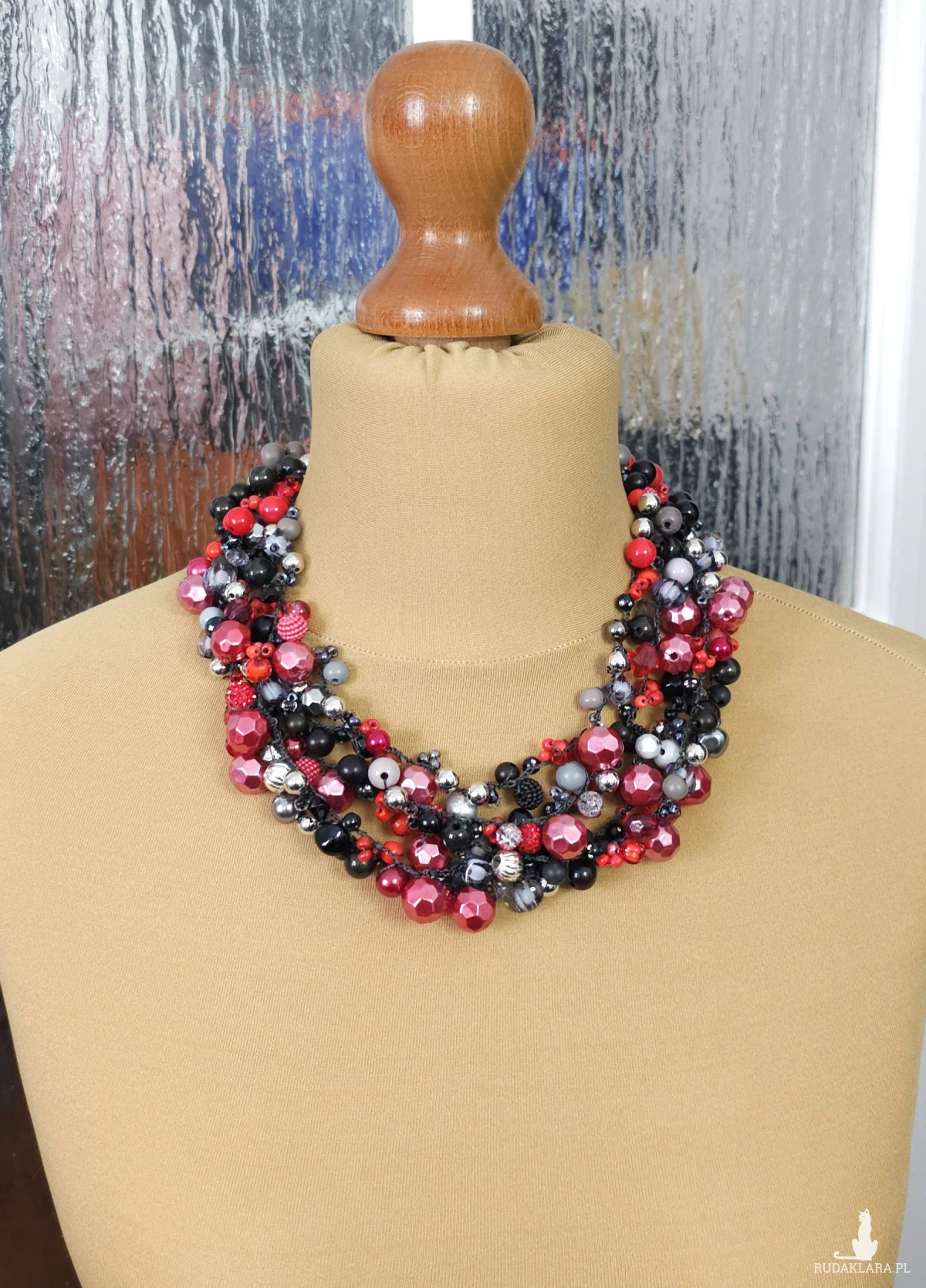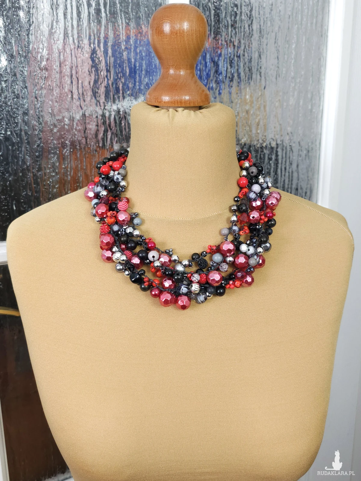 Ten ręcznie wykonany naszyjnik to połączenie dziesiątek koralików o różnych fakturach i kształtach.