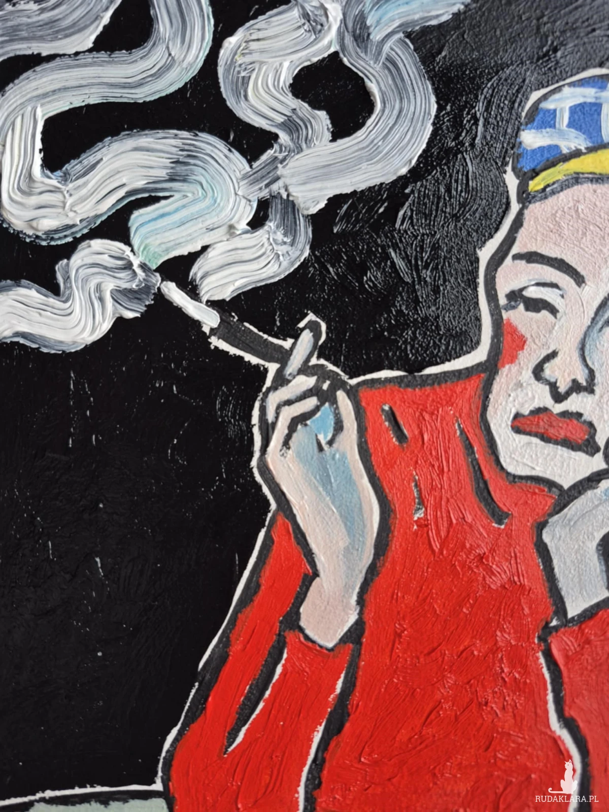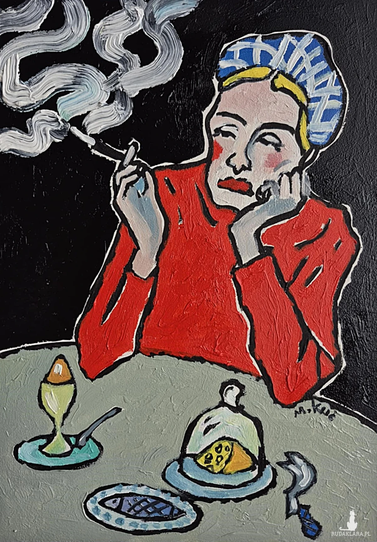 Dym z papierosa nie unosi się lekko — raczej wije się ciężko, grubą kreską, przypominając myśli, które nie potrafią znaleźć ujścia. Tworzy znaki, które niczego nie wyjaśniają, a jednak mówią wszystko. Oczy kobiety są półprzymknięte, nieobecne; patrzą gdzieś poza stół, poza chwilę.