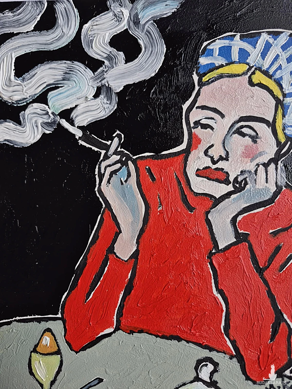 Całość przypomina sen w kawiarni, który trwa sekundę za długo. Obraz mówi o czekaniu, o samotności w miejscu publicznym, o chwili, w której czas przestaje być potrzebny. To portret ciszy — gęstej jak dym i równie trudnej do rozproszenia.
