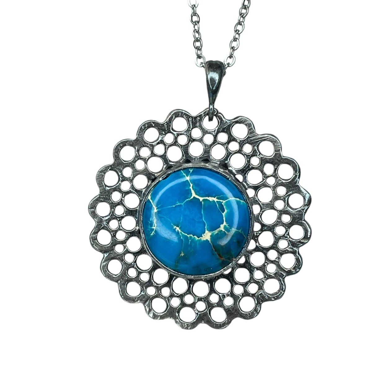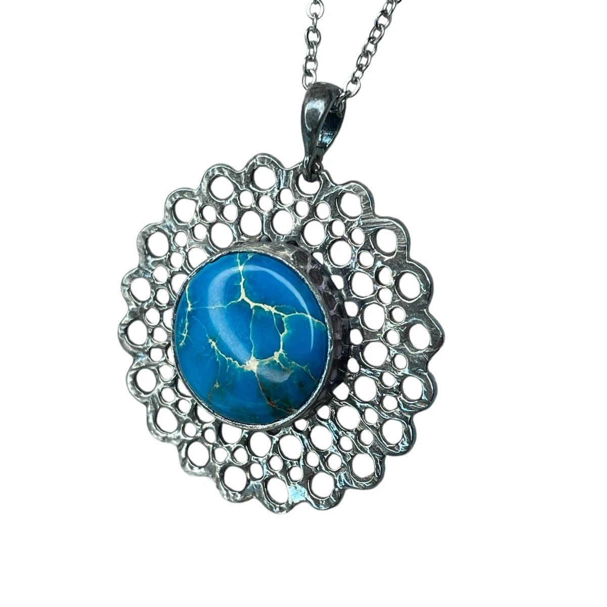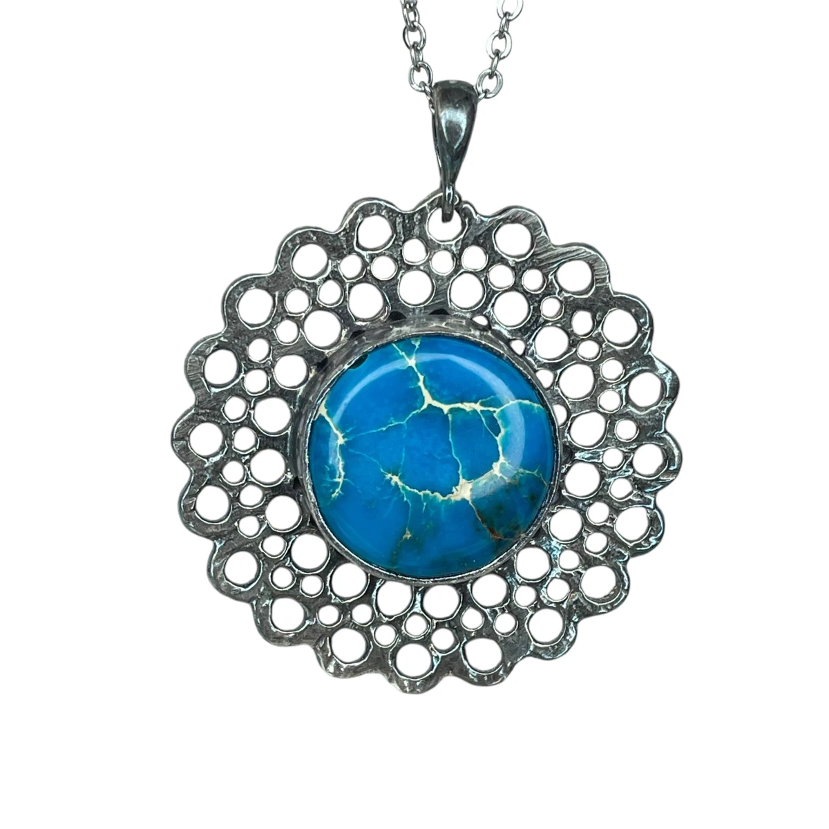 Wisior ze srebra próby 925 jest inspirowany delikatnymi strukturami koronki. W środku okrągłej formy wykonanej techniką metaloplastyki znajduje się błękitny jaspis cesarski o średnicy 15 milimetrów. Ażurowa struktura naszyjnika jest bogata w detale, które urozmaicą klasyczną lub minimalistyczną stylizację. Będzie również trafionym prezentem dla bliskiej osoby, która ceni sobie oryginalne dodatki na co dzień. Wykonany jest z oksydowanego srebra próby 925, dzięki czemu odcień srebra jest ciemniejszy, a ażurowa struktura wisiora subtelnie podkreślona.