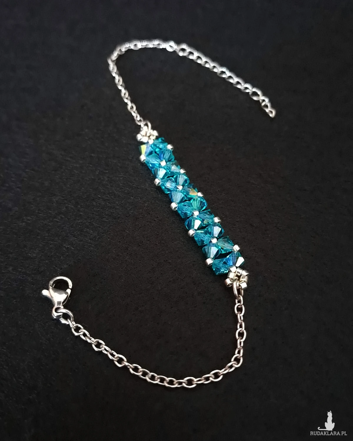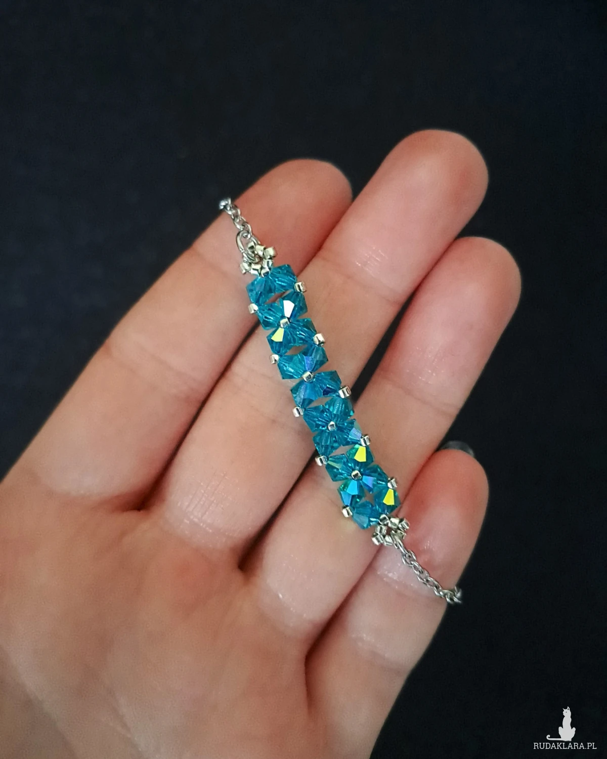 Bransoletka powstaje z kryształków Preciosa w kolorze Blue Zircon AB, które dzięki opalizującemu wykończeniu pięknie odbijają światło, ukazując intensywny, chłodny odcień turkusowego błękitu z delikatnym, tęczowym połyskiem. Towarzyszą im drobne koraliki Miyuki Delica w srebrnym odcieniu, znane z wyjątkowej regularności i precyzji wykonania.