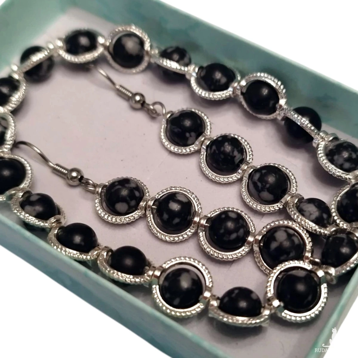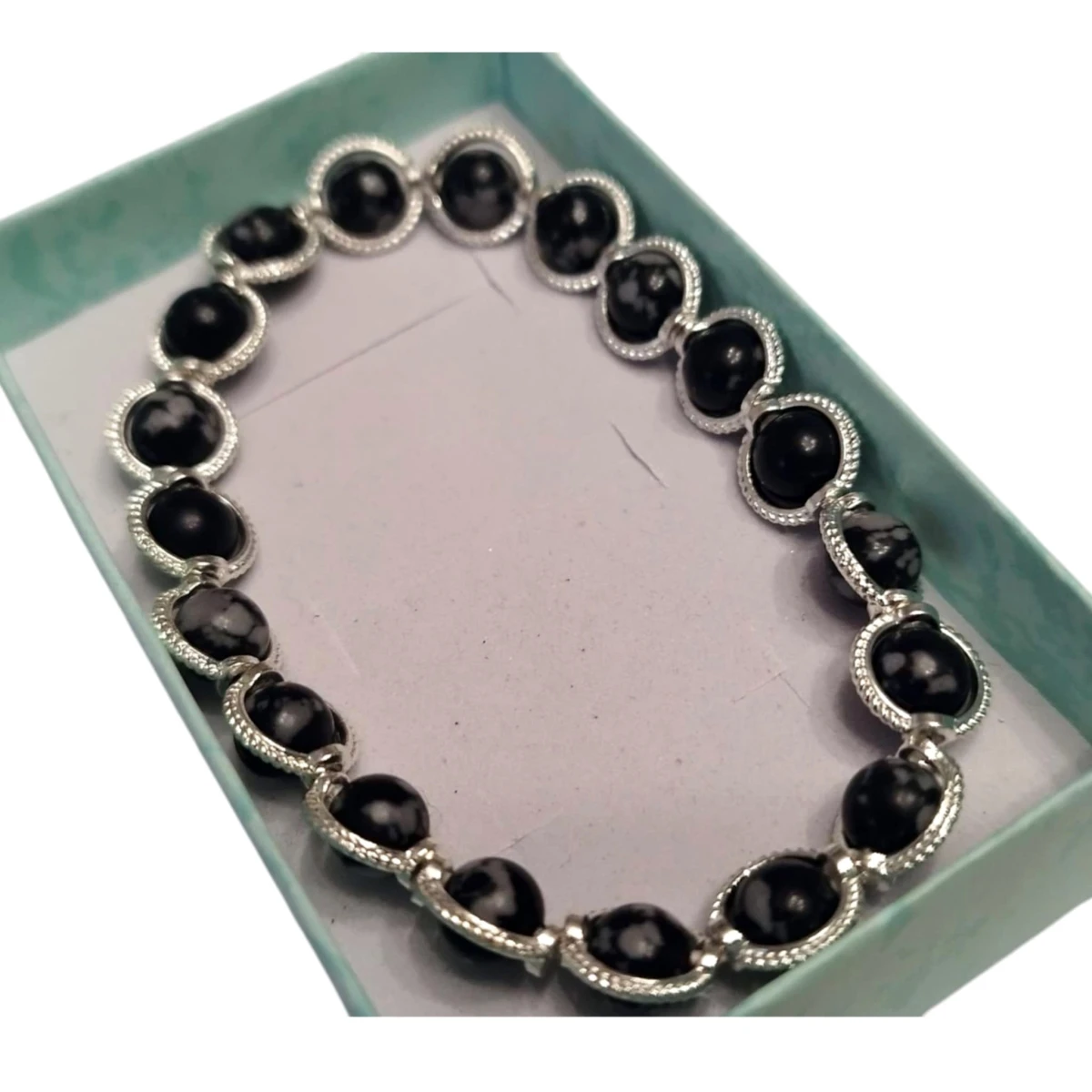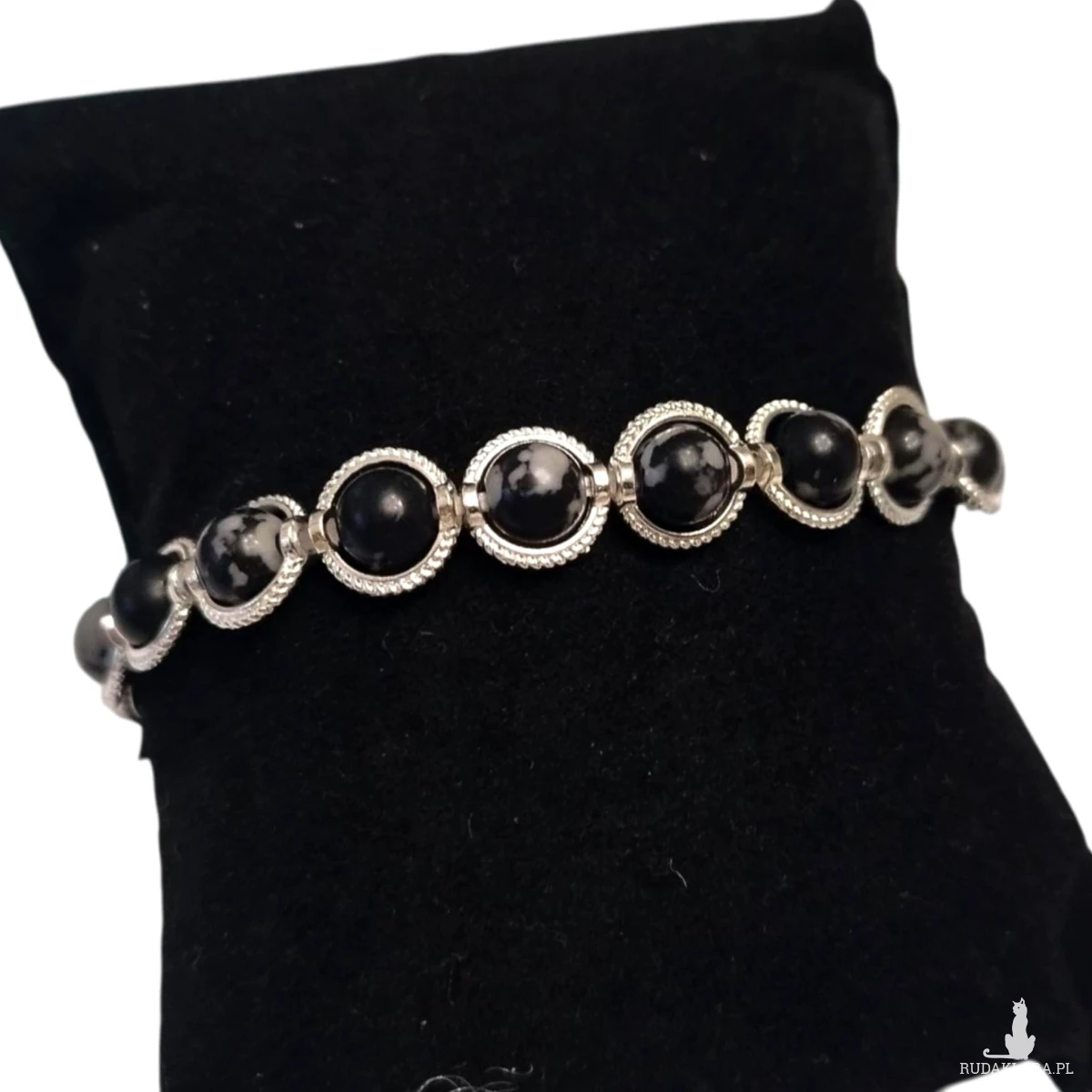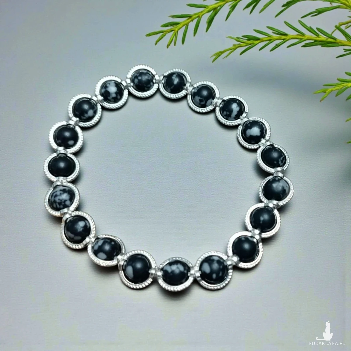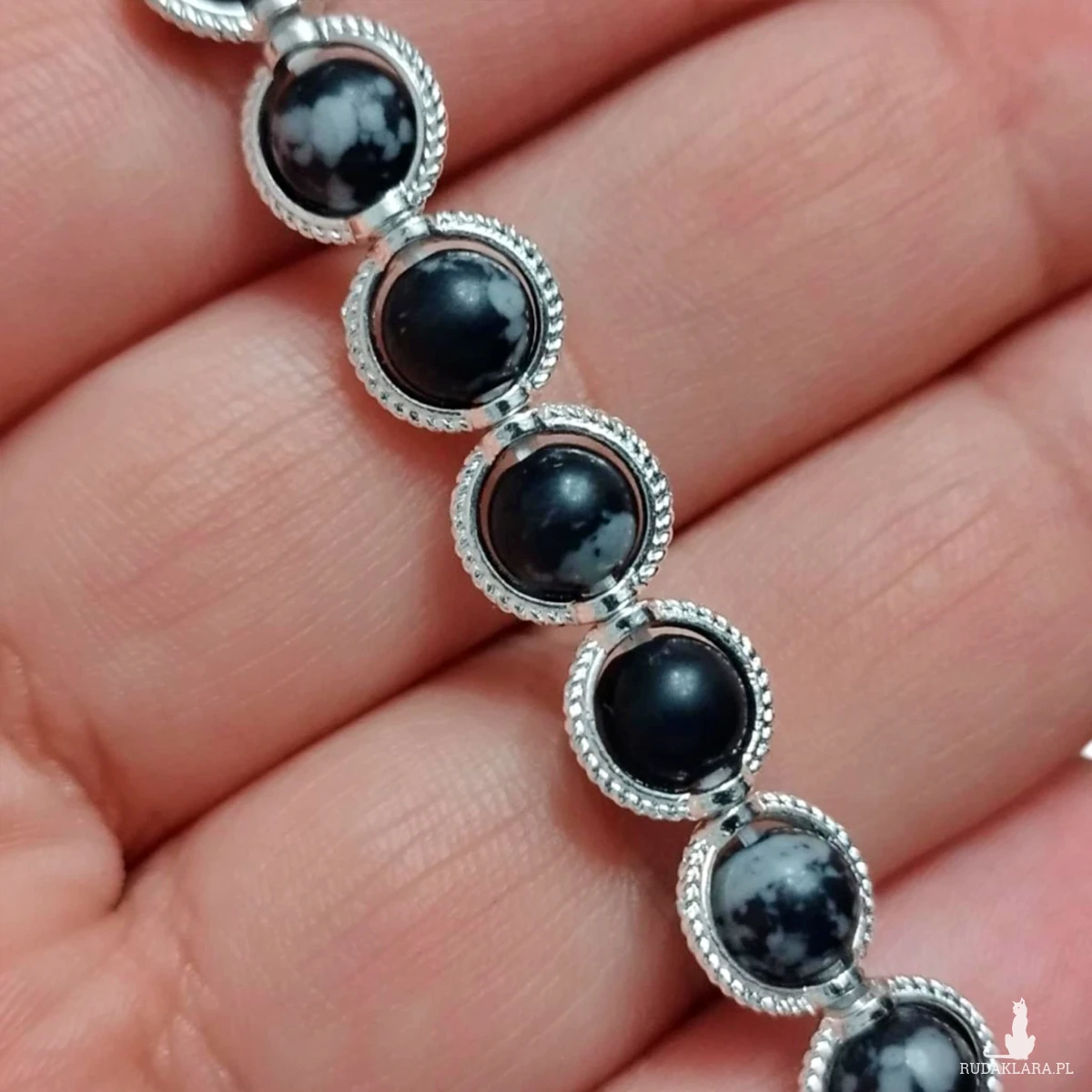 Bransoletka z naturalnych kamieni obsydianu śnieżnego to elegancka i wyjątkowa biżuteria. Czarny kolor, szaro białe przetarcia oraz dodatkowe obrączki na kamykach w kolorze srebrnym dodają jej uroku.
