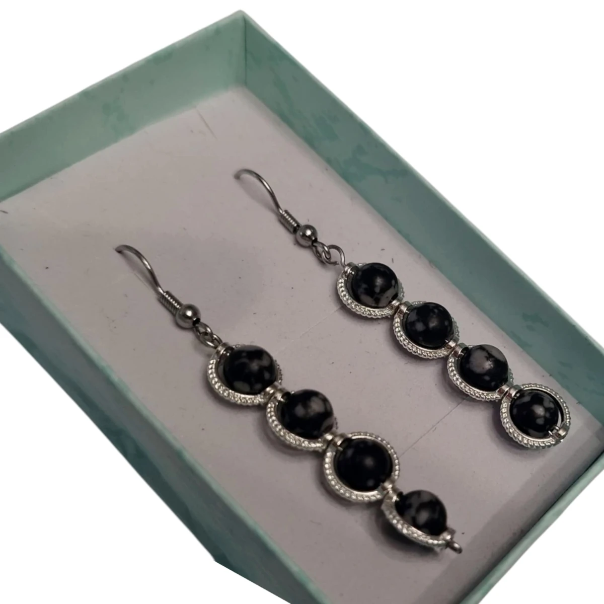 Kolczyki z kamienia obsydianu śnieżnego to elegancka i wyjątkowa biżuteria. Czarny kolor z szarymi przetarciami oraz pierścienie w kolorze srebrnym wokół kamieni dodają im uroku
