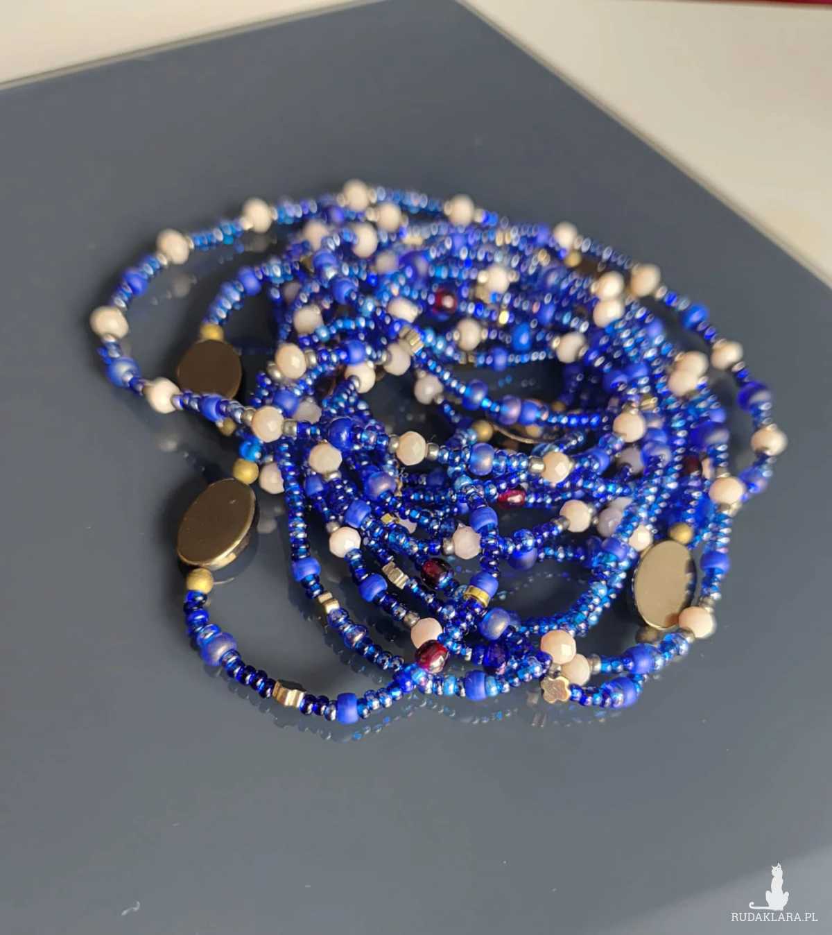 koralików w tym samym odcieniu niebieskim. Przeplatane są kryształkami w