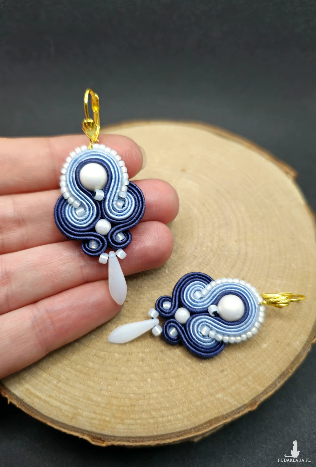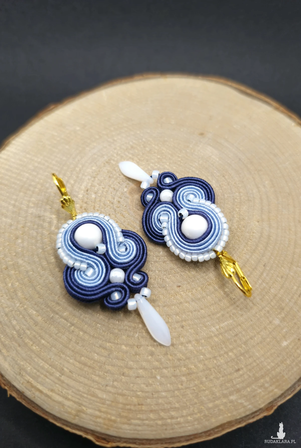 Białe mieniące się kulki otoczone sznurkami sutasz oraz szklanymi czeskimi i japońskimi koralikami o rożnych kształtach i wielkościach. Dół kolczyków zdobią szklane wiszące koraliki. Kolczyki zawieszone na ozdobnych biglach angielskich w kolorze złotym.