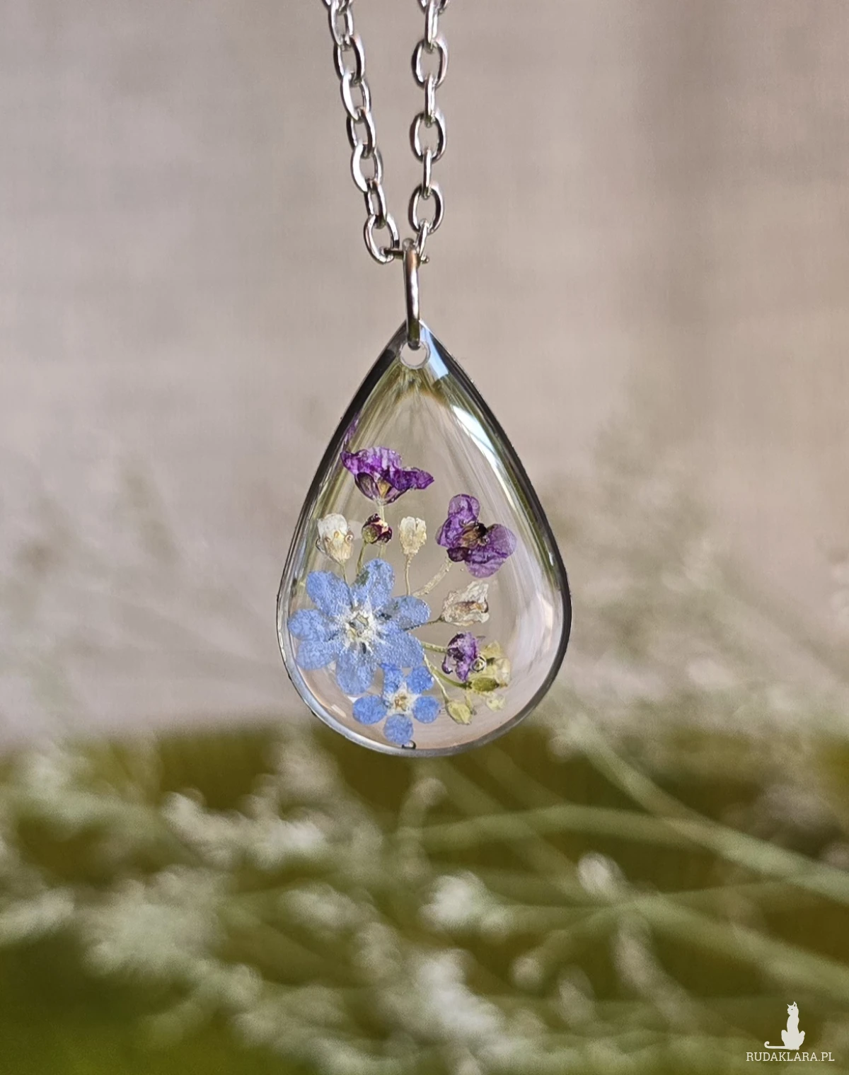 Oferuję Państwu unikalną biżuterię. Zawieszka jest wykonana z suszonych kwiatów i żywicy epoksydowej. Biżuteria jest wspaniałym i oryginalnym prezentem na lata.