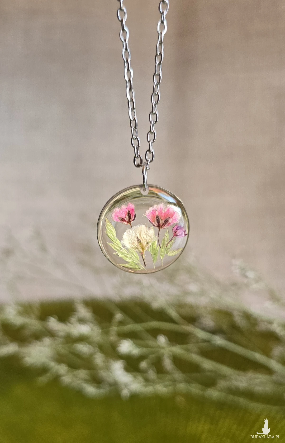 Oferuję Państwu unikalną biżuterię. Zawieszka jest wykonana z suszonych kwiatów i żywicy epoksydowej. Biżuteria jest wspaniałym i oryginalnym prezentem na lata.