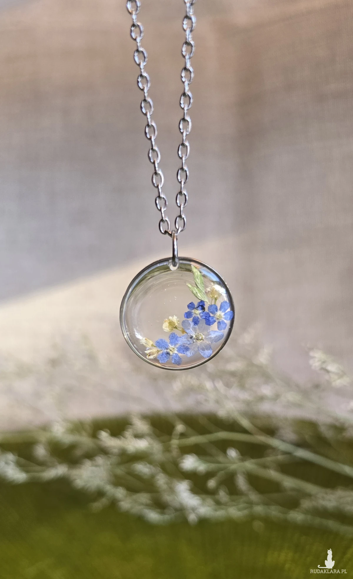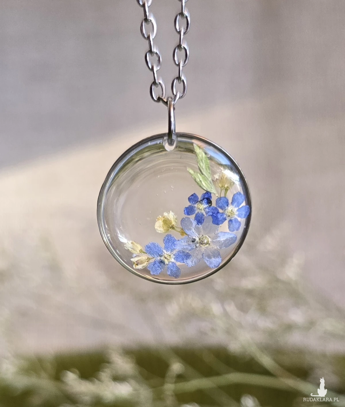 Oferuję Państwu unikalną biżuterię. Zawieszka jest wykonana z suszonych kwiatów i żywicy epoksydowej. Biżuteria jest wspaniałym i oryginalnym prezentem na lata.