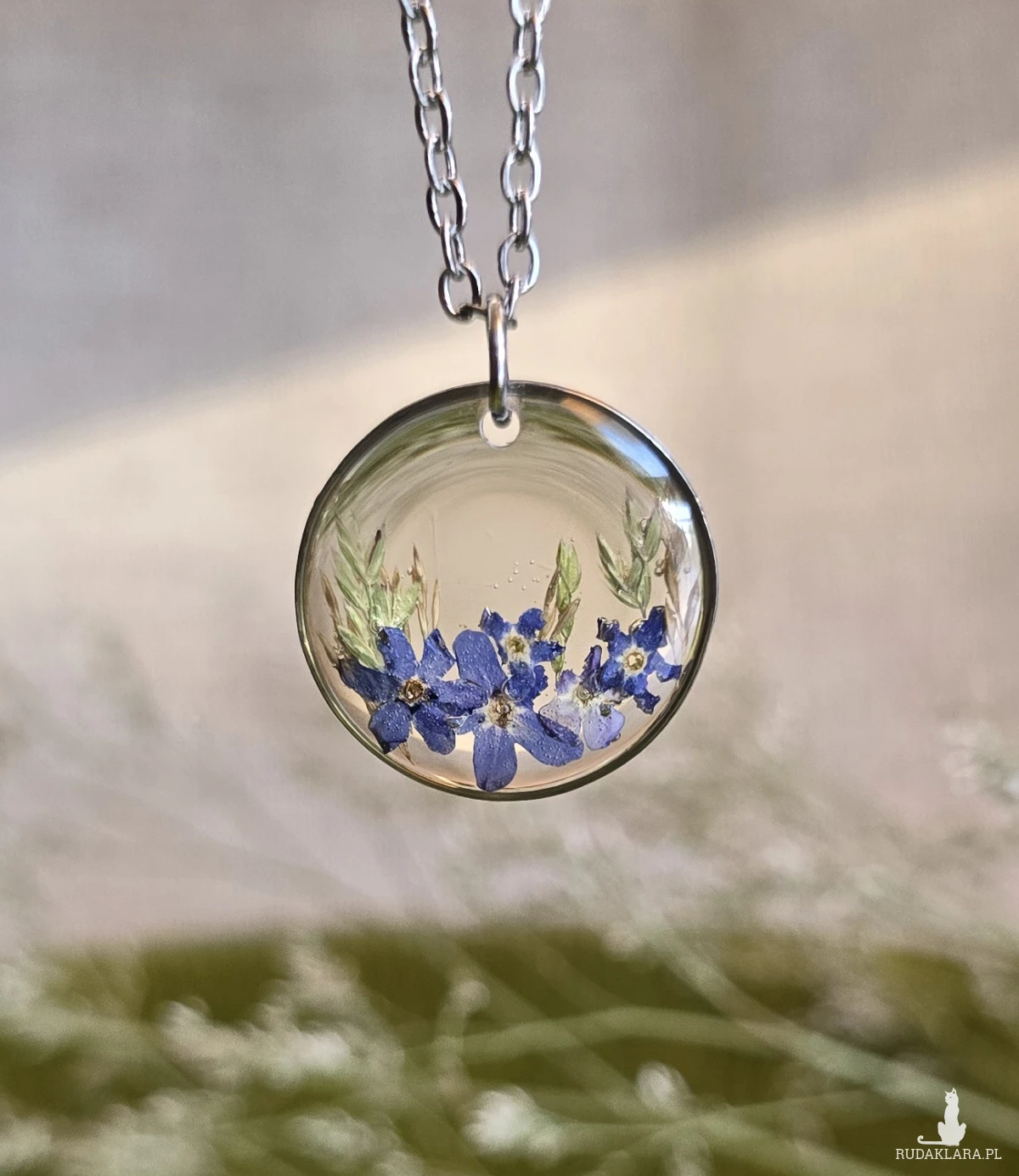 Oferuję Państwu unikalną biżuterię. Zawieszka jest wykonana z suszonych kwiatów i żywicy epoksydowej. Biżuteria jest wspaniałym i oryginalnym prezentem na lata.