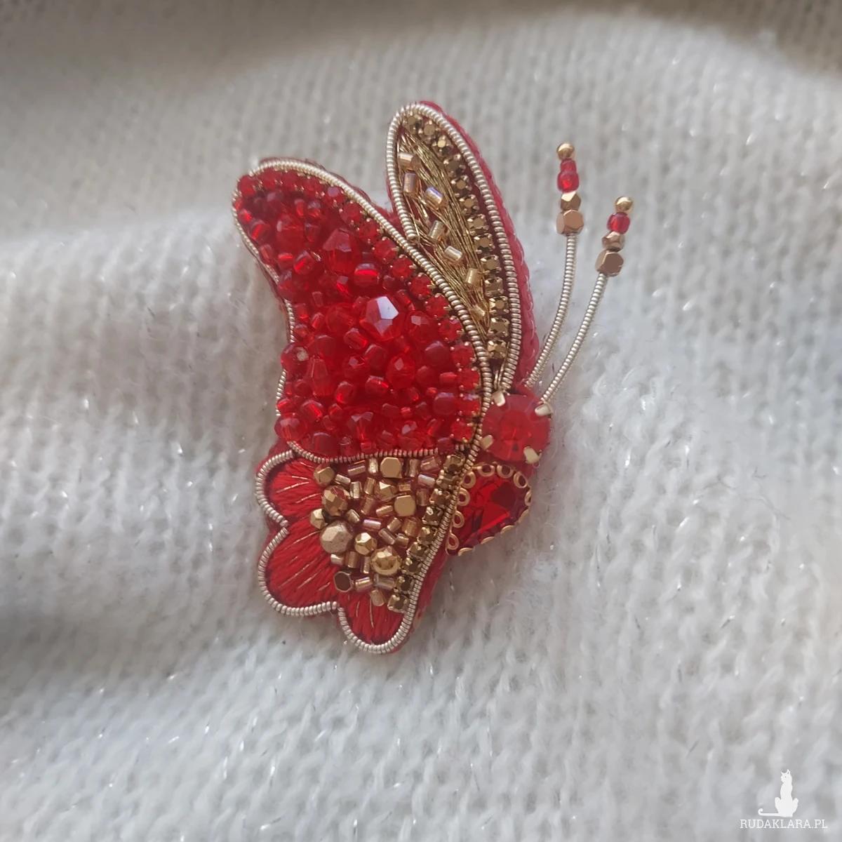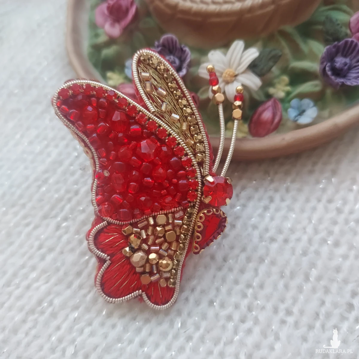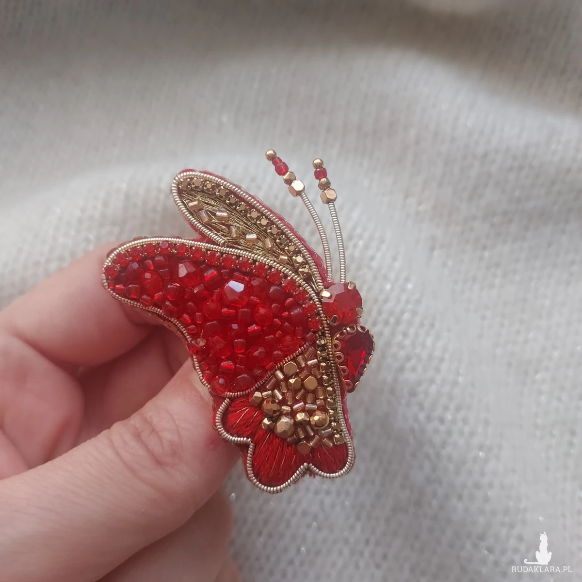 Jeśli tak, to mam dla Ciebie wyjątkową, kolorową broszkę MOTYLA w przepięknym kolorze czerwieni i złota. Powstała z dbałością o szczególy haftem koralikowym oraz płaskim.