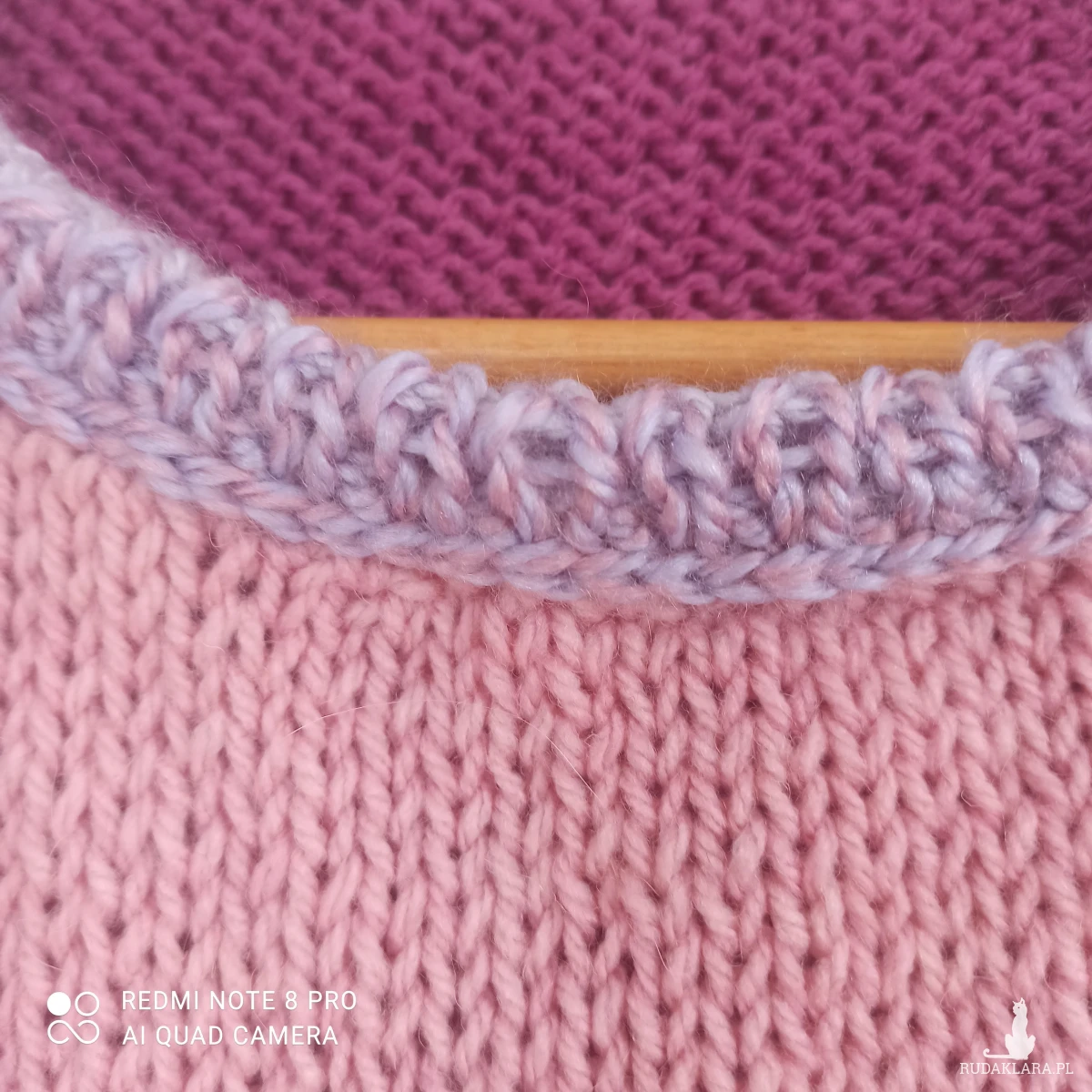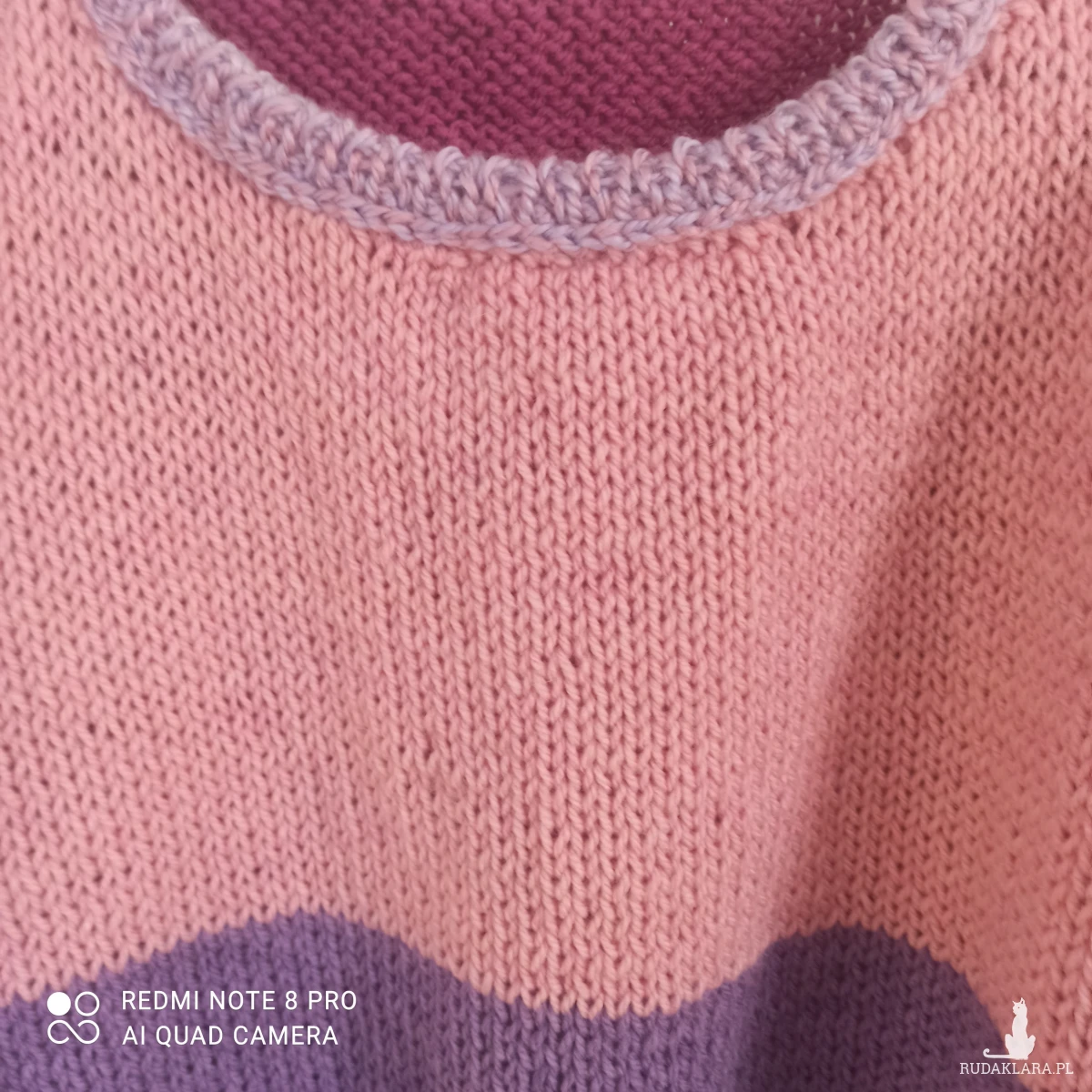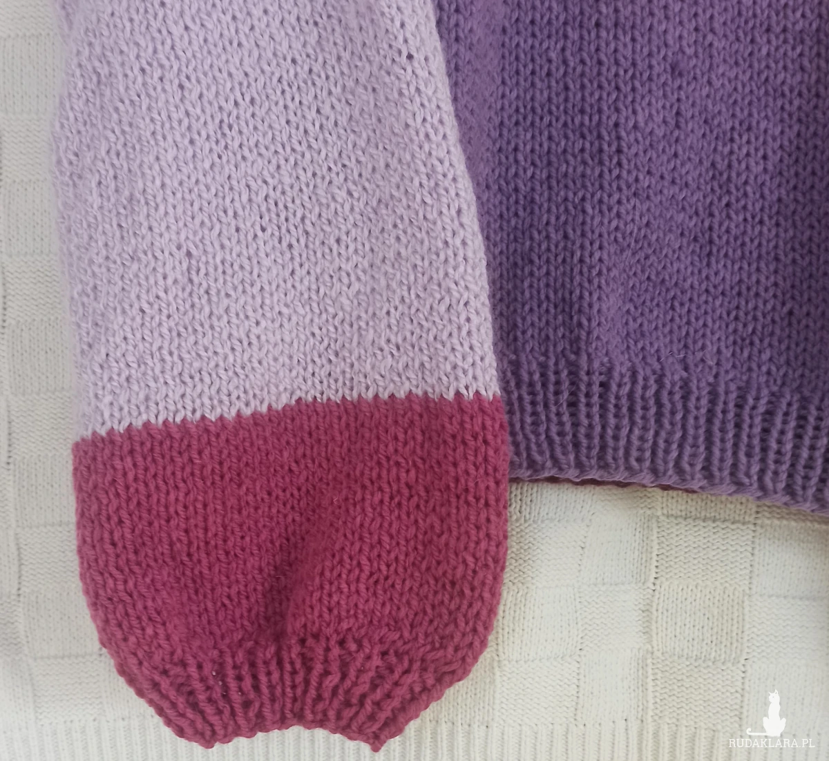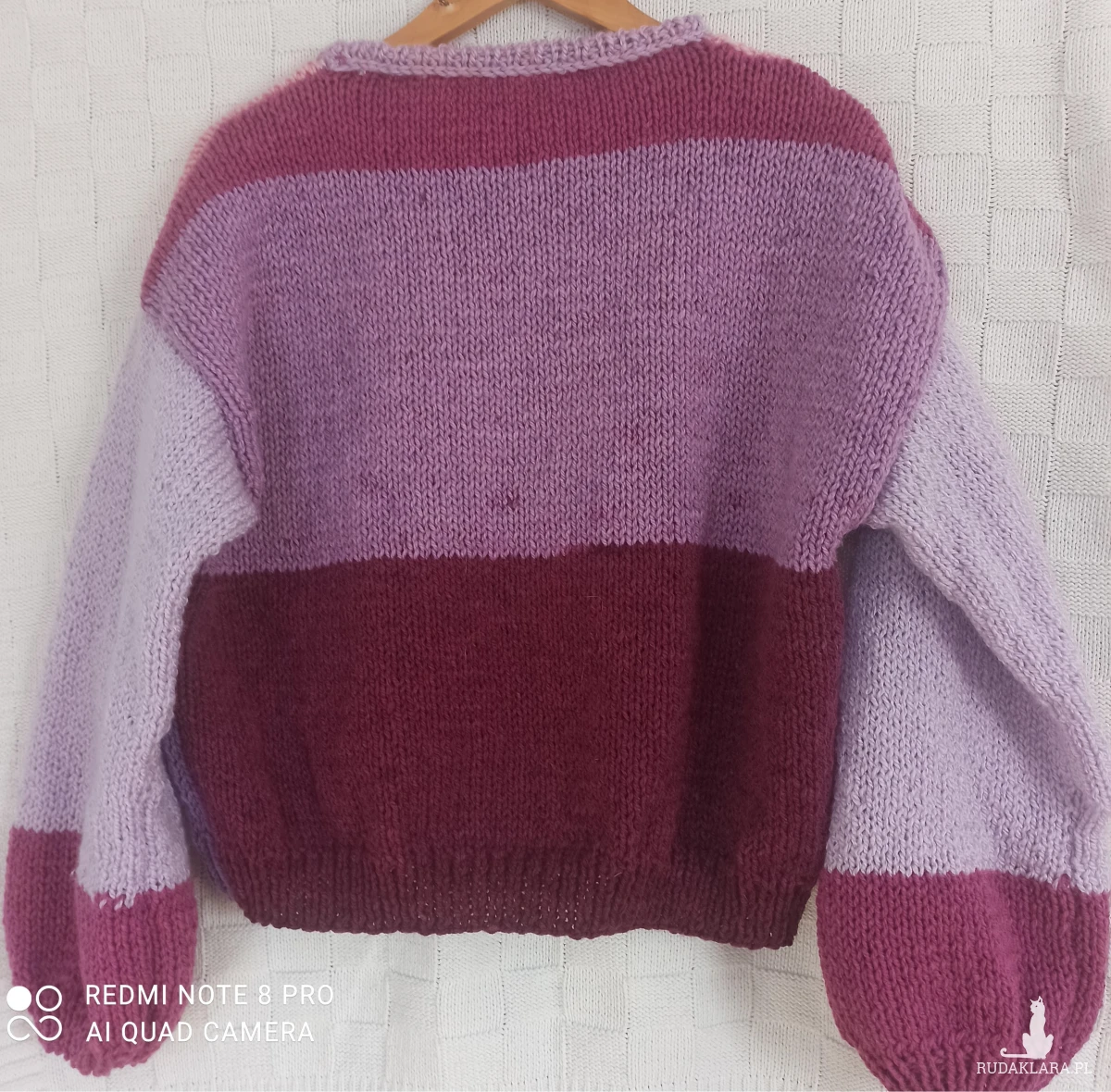 Sweter pod szyję kolorowy oversize z długimi szerokimi rękawami. Średnio gruby. Bardzo lekki, wykonany ręcznie na drutach. Wykonany z włóczki z poliamidem w różnej kolorystyce, w motku kolory sukcesywnie się zmieniają. Przód różowo-śliwkowy, tył burgund i fioletowy, rękawy burgund i jasny fiolet. Pliska przy szyi luźna, swobodnie otacza szyję. Całość wykonana oczkami prawymi. Ściągacze i pliska swetra wykonane ściegiem ściągaczowym oczko lewe, oczko prawe. Jest niezwykle miły w dotyku, nie drapie. Przewiewny ale ciepły, krótki i szeroki. Można nosić bez koszulki. Świetna propozycja dla nastolatek. Opadające ramiona przedłużają długość rękawa. Rękawy dosyć szerokie i długie. Wspaniały look do spódnicy i spodni, stanowi elegancką kompozycję. W rzeczywistości wygląda zdecydowanie lepiej. Pranie ręczne w kąpieli do 30 stopni.