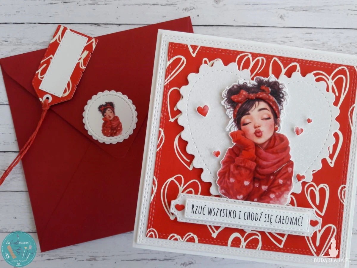 Ręcznie robiona kartka walentynkowa z całuśną dziewczyną wykonana metodą scrapbookingu z wykorzystaniem profesjonalnych materiałów i z dbałością o każdy szczegół.