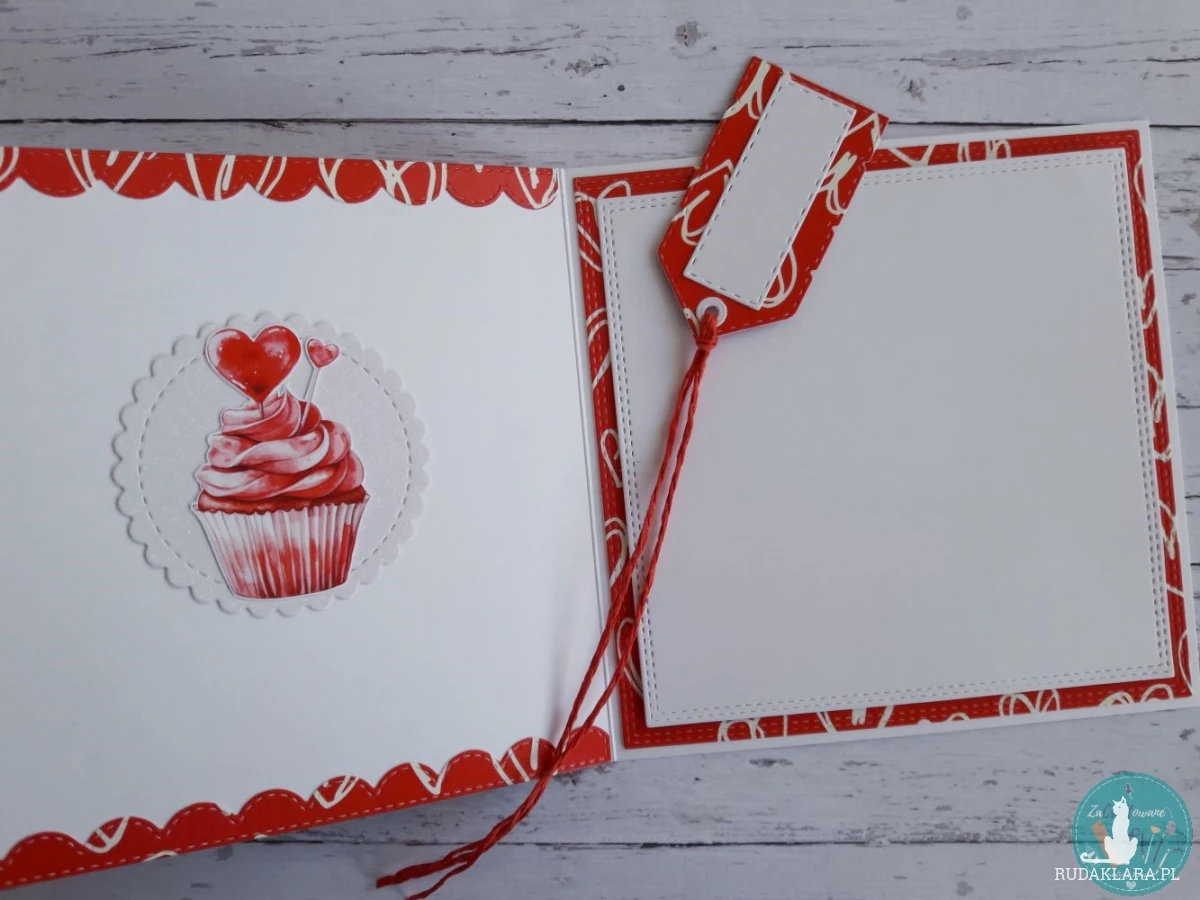 Do kartki dołączam GRATIS w postaci widocznej na zdjęciu etykietki, za pomocą której można podpisać upominek walentynkowy i przyczepić ją do wstążki, którą obwiązany jest prezent, za pomocą sznureczka, który również znajduje się w zestawie.