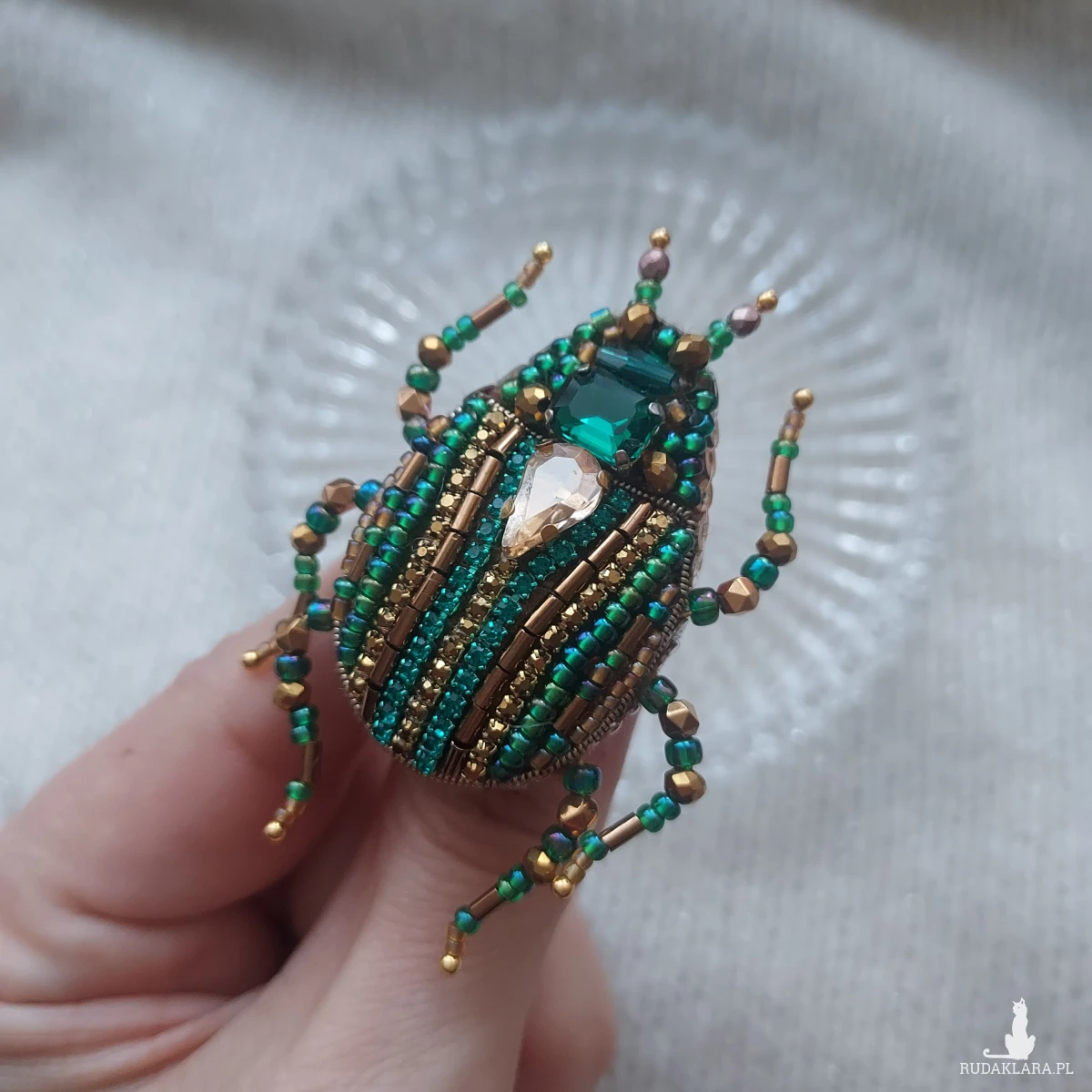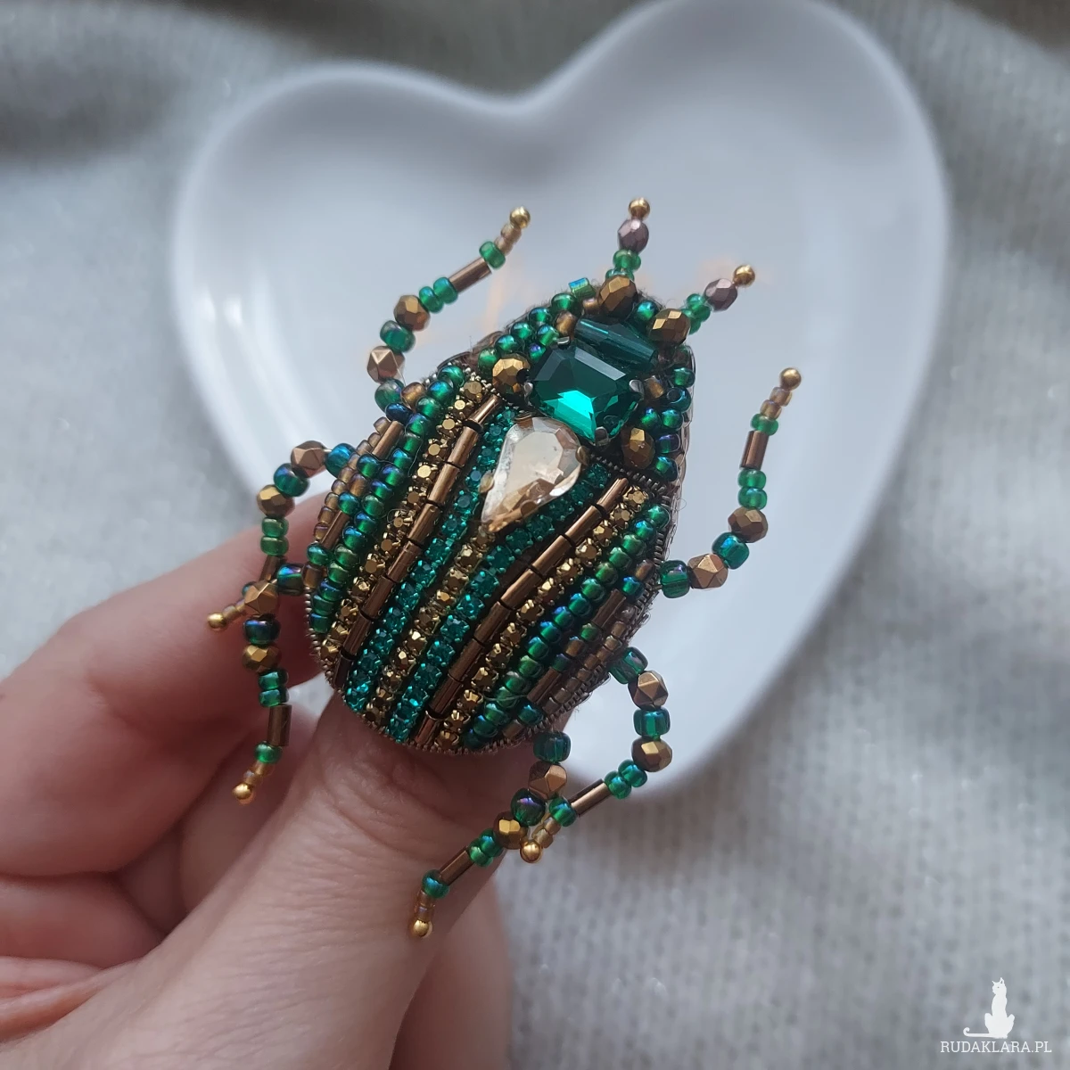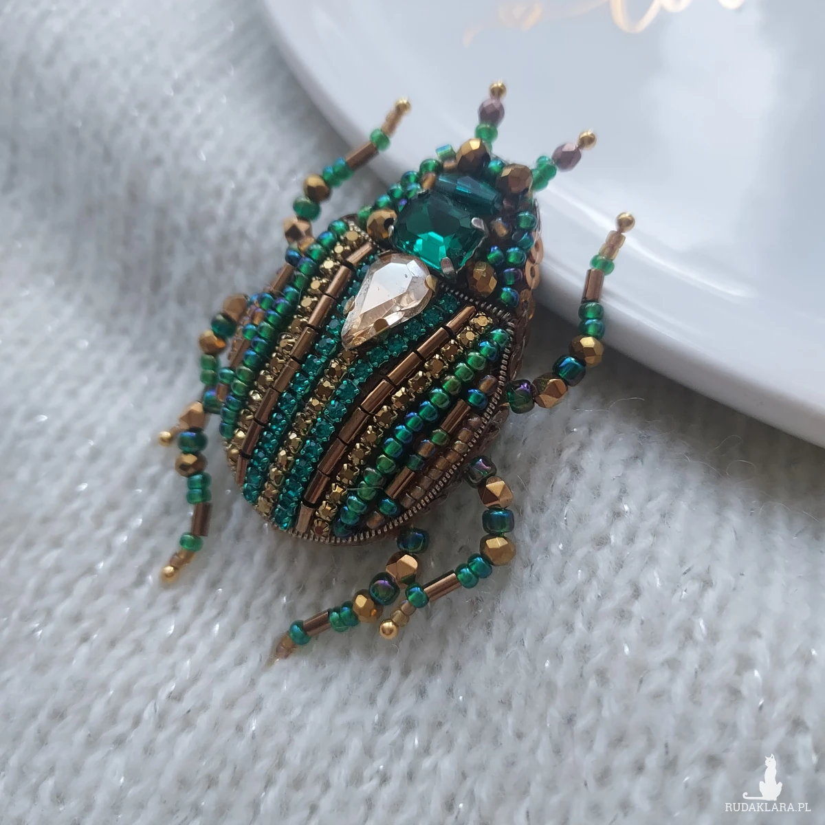 Urocza broszka ŻUK w cudownym zestawieniu brązu i zieleni to niezwykły dodatek biżuteryjny nie tylko dla miłośniczek przyrody i owadów.