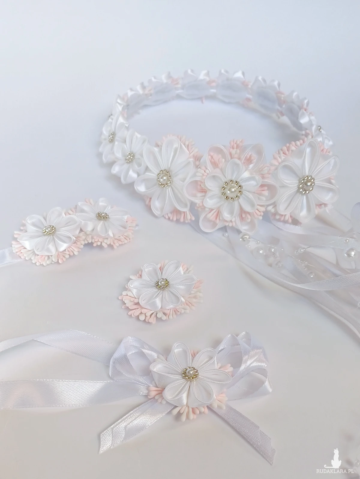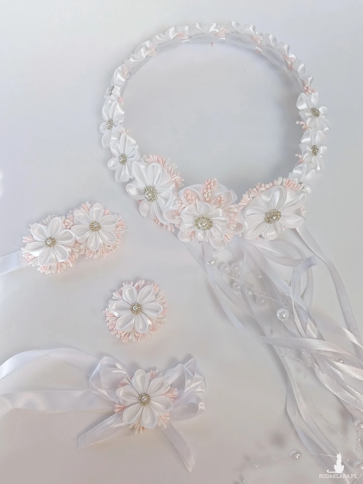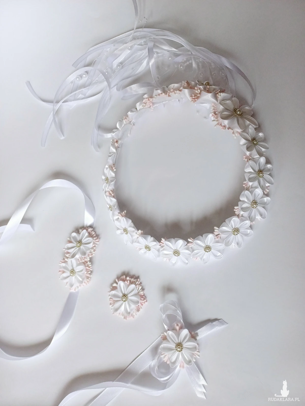 Piękny wianek komunijny plus ozdoby: na rękę, na świecę i na torebkę. Cały zestaw stworzyłam sama. Baza wianka - Kwiaty trzymają się na delikatnym, cienkim drucie owiniętym satynową białą wstążką. Wianek nie jest "zamknięty", dlatego można go delikatnie dopasować do obwodu głowy dziecka - wiązanie za pomocą wstążek. W komplecie dodatkowy kwiatuszek luzem, aby wsunąć na wianek w razie potrzeby (gdyby obwód głowy był większy). Kwiaty do wianka wykonałam z białych tasiemek satynowych japońską metodą tsumami. Większość kwiatów na wianku ma średnicę 4cm, natomiast stroik na tyle wianka składa się z kwiatów o średnicy: środkowy 6cm, a dwa boczne 5cm. Na środku kwiatów jest przyklejona biała półperełka z kryształkami wokół niej, kwiaty ozdobione są kolorowymi pręcikami (róż, biel). Tył wianka ozdabiają również luźno spuszczone wstążki o szerokości 6mm oraz długości około 31cm. Śliczny efekt tworzy również biała girlanda z perełek miedzy wiszącymi wstążkami.