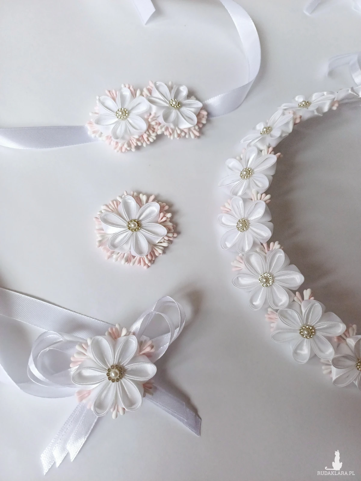 Dodatki: Ozdoba na torebkę to kwiatek o średnicy 4cm, ozdobiony białymi i różowymi pręcikami, przytwierdzony do agrafki 2cm. Ozdoby na rękę i świecę to również kwiaty o średnicy 4cm, ozdobione do kompletu z wiankiem, przymocowane do białej wstążki szerokości 12mm. Wstążki są dłuższe, co pozwoli dopasować ich długość do potrzeb.