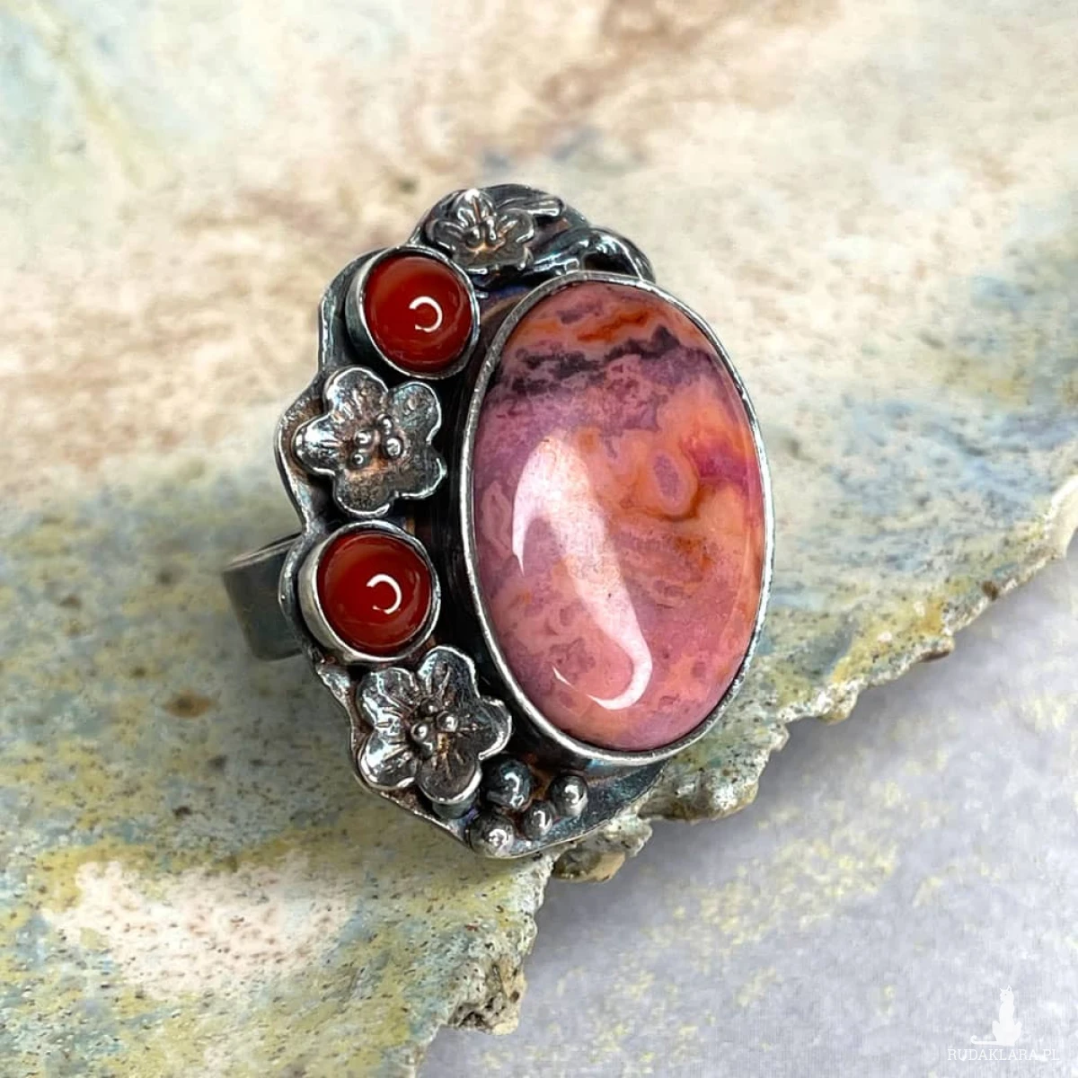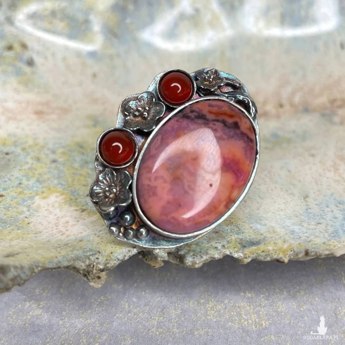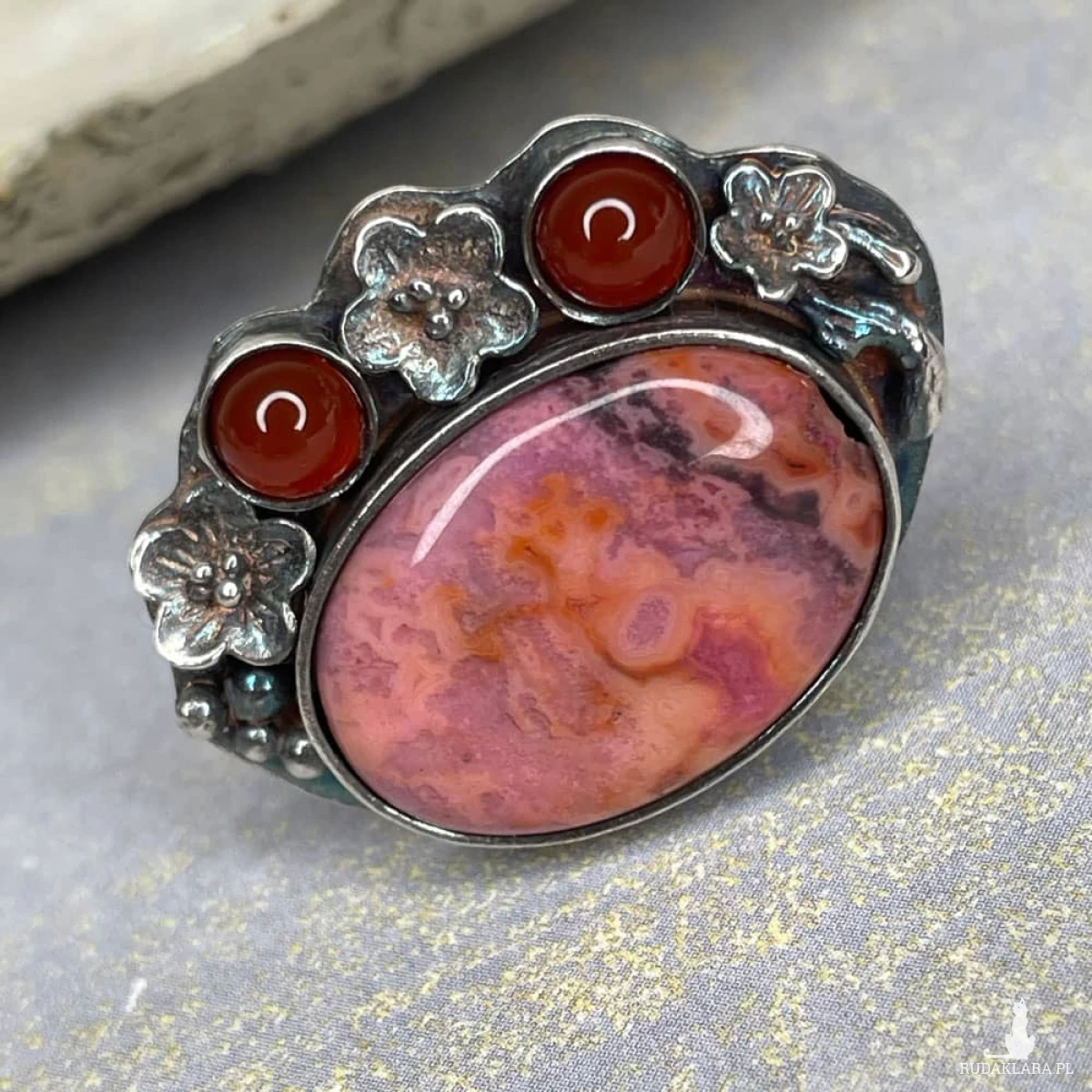 Jak malarski pejzaż inspirowany zachodzącym słońcem – agat koronkowy zachwyca subtelną grą barw, łącząc odcienie różu, pomarańczu i barw pomiędzy w jedyny w swoim rodzaju wzór. Jego ciepłe tony doskonale komponują się z intensywną czerwienią karneoli, które niczym ostatnie promienie zachodu słońca dodają kompozycji głębi i charakteru. Oksydowane srebro, ozdobione misternymi kwiatowymi detalami, podkreśla artystyczny styl biżuterii, nadając jej romantycznego, lekko baśniowego uroku Kamień: agat koronkowy, karneol Materiał: srebro próby 925 Wykończenie czernione, miejscowo przecierane, miejscowo polerowane Rozmiar jubilerski: 15 mm Wielkość kamienia: 20×15 mm Waga produktu: 10,53 g Masa srebra: 7,6 g Biżuteria zostanie zapakowana w ozdobne pudełko. Ze względu na różne ustawienia monitorów, kolory mogą się delikatnie różnić na żywo.